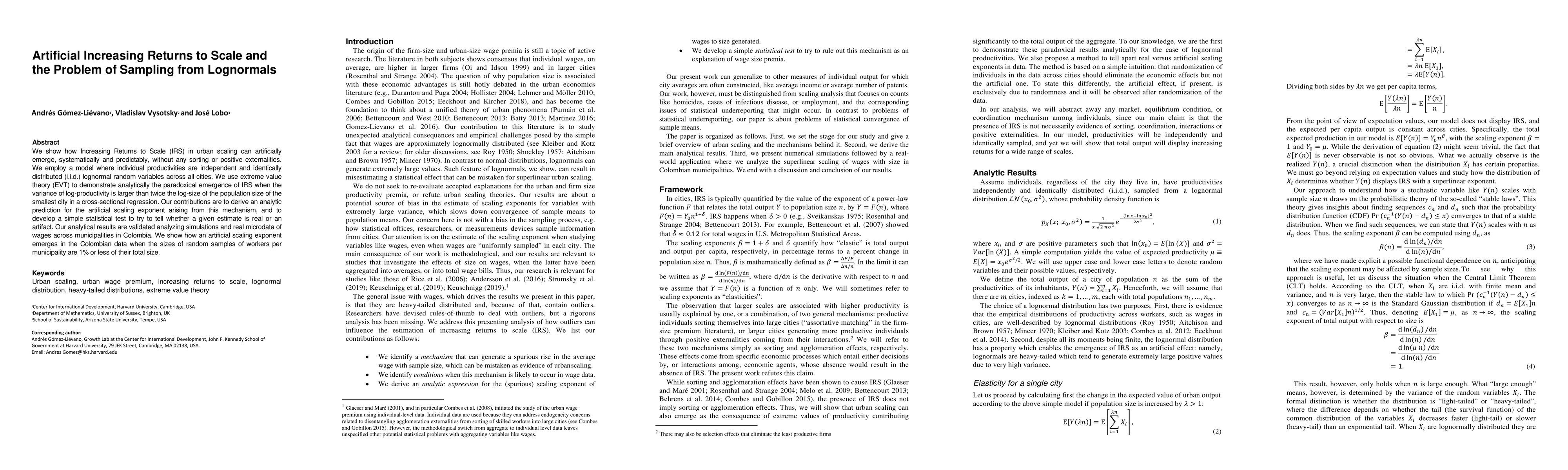 We show how increasing returns to scale in urban scaling can artificially emerge, systematically and predictably, without any sorting or positive externalities. We employ a model where individual productivities are independent and identically distributed lognormal random variables across all cities. We use extreme value theory to demonstrate analytically the paradoxical emergence of increasing returns to scale when the variance of log-productivity is larger than twice the log-size of the population size of the smallest city in a cross-sectional regression. Our contributions are to derive an analytical prediction for the artificial scaling exponent arising from this mechanism and to develop a simple statistical test to try to tell whether a given estimate is real or an artifact. Our analytical results are validated analyzing simulations and real microdata of wages across municipalities in Colombia. We show how an artificial scaling exponent emerges in the Colombian data when the sizes of random samples of workers per municipality are $1\%$ or less of their total size.