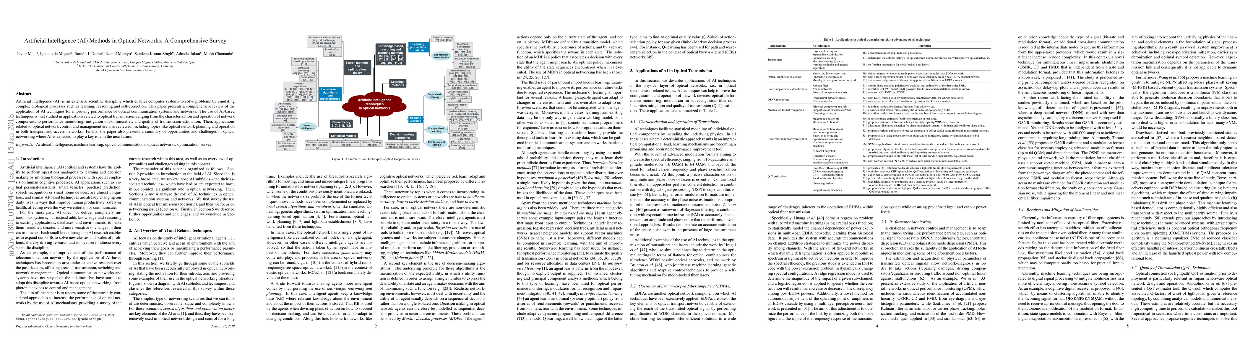 This paper provides a comprehensive review of AI techniques applied to optical communication systems, focusing on AI's role in enhancing transmission performance, network control, and management, while also discussing future opportunities and challenges in optical networking.