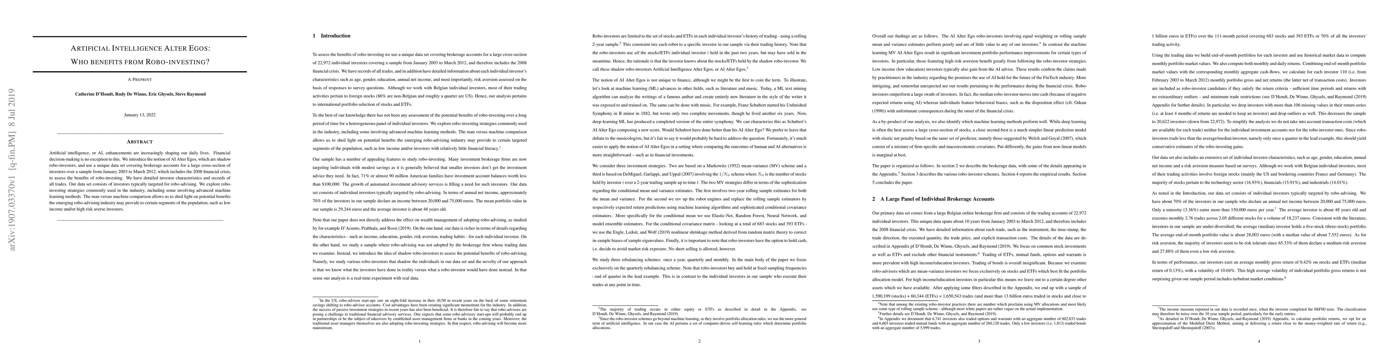 This paper examines the benefits of robo-investing through AI Alter Egos, comparing their performance against human investors using a comprehensive dataset from 2003 to 2012. It highlights potential advantages for low-income and high-risk averse investors in the emerging robo-advising industry.
