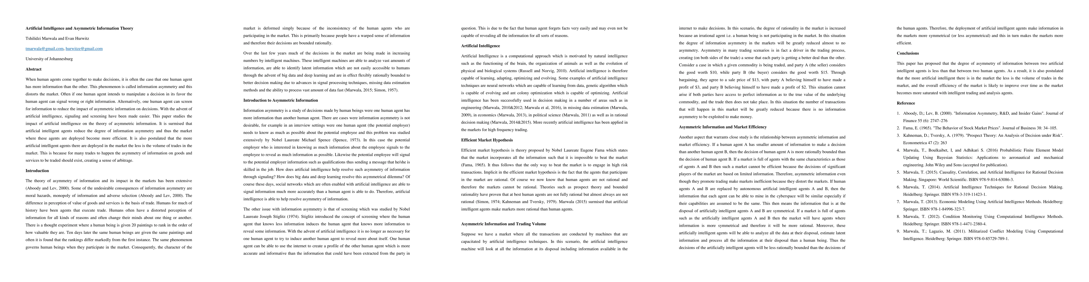 When human agents come together to make decisions, it is often the case that one human agent has more information than the other. This phenomenon is called information asymmetry and this distorts the market. Often if one human agent intends to manipulate a decision in its favor the human agent can signal wrong or right information. Alternatively, one human agent can screen for information to reduce the impact of asymmetric information on decisions. With the advent of artificial intelligence, signaling and screening have been made easier. This paper studies the impact of artificial intelligence on the theory of asymmetric information. It is surmised that artificial intelligent agents reduce the degree of information asymmetry and thus the market where these agents are deployed become more efficient. It is also postulated that the more artificial intelligent agents there are deployed in the market the less is the volume of trades in the market. This is because for many trades to happen the asymmetry of information on goods and services to be traded should exist, creating a sense of arbitrage.