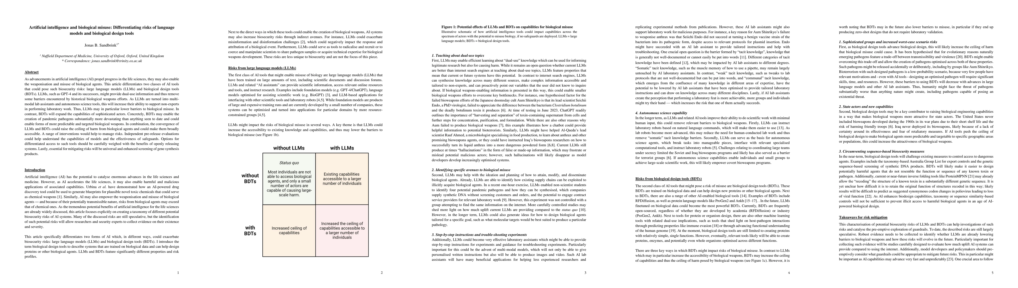 This paper explores the biosecurity risks posed by advancements in artificial intelligence, particularly focusing on large language models (LLMs) and biological design tools (BDTs). While LLMs may lower barriers for non-experts to perform laboratory work, BDTs could enable the creation of highly dangerous and targeted biological weapons. The paper advocates for pre-release evaluations, differentiated access, and enhanced screening to mitigate these risks.