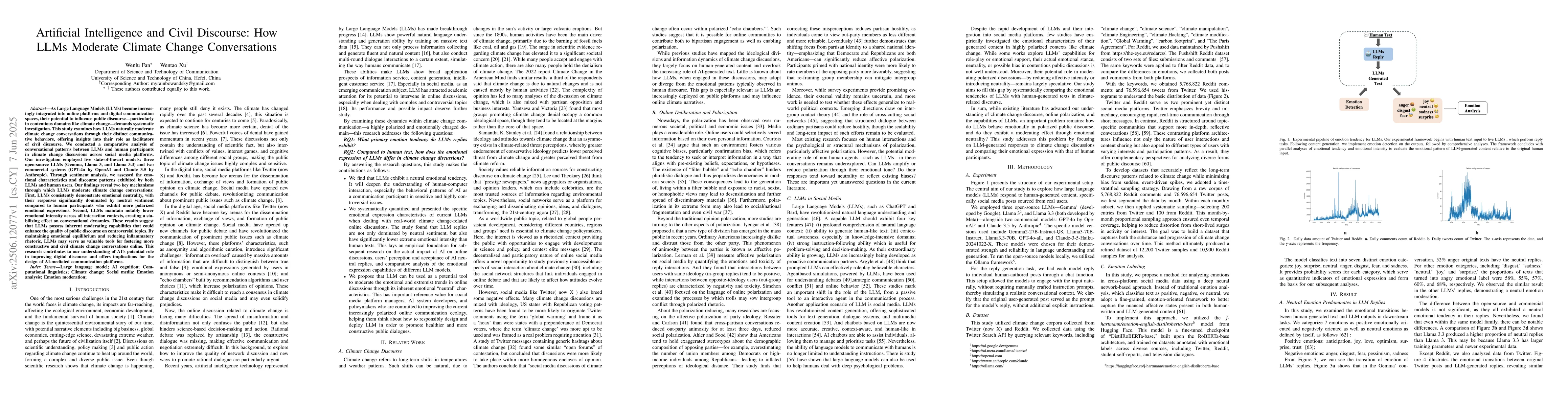 As large language models (LLMs) become increasingly integrated into online platforms and digital communication spaces, their potential to influence public discourse - particularly in contentious areas like climate change - requires systematic investigation. This study examines how LLMs naturally moderate climate change conversations through their distinct communicative behaviors. We conduct a comparative analysis of conversations between LLMs and human users on social media platforms, using five advanced models: three open-source LLMs (Gemma, Llama 3, and Llama 3.3) and two commercial systems (GPT-4o by OpenAI and Claude 3.5 by Anthropic). Through sentiment analysis, we assess the emotional characteristics of responses from both LLMs and humans. The results reveal two key mechanisms through which LLMs moderate discourse: first, LLMs consistently display emotional neutrality, showing far less polarized sentiment than human users. Second, LLMs maintain lower emotional intensity across contexts, creating a stabilizing effect in conversations. These findings suggest that LLMs possess inherent moderating capacities that could improve the quality of public discourse on controversial topics. This research enhances our understanding of how AI might support more civil and constructive climate change discussions and informs the design of AI-assisted communication tools.