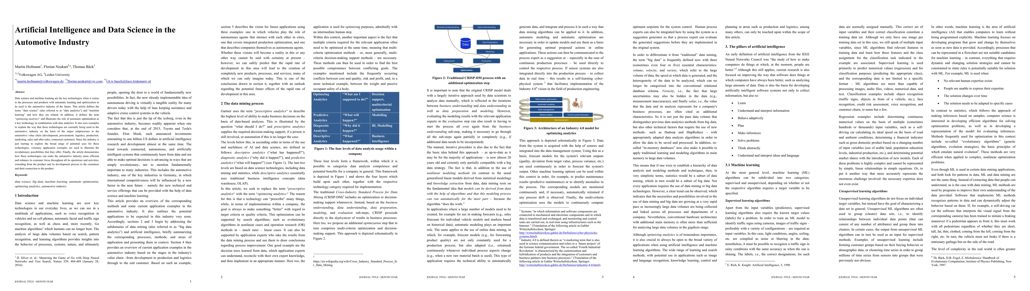 Data science and machine learning are the key technologies when it comes to the processes and products with automatic learning and optimization to be used in the automotive industry of the future. This article defines the terms "data science" (also referred to as "data analytics") and "machine learning" and how they are related. In addition, it defines the term "optimizing analytics" and illustrates the role of automatic optimization as a key technology in combination with data analytics. It also uses examples to explain the way that these technologies are currently being used in the automotive industry on the basis of the major subprocesses in the automotive value chain (development, procurement; logistics, production, marketing, sales and after-sales, connected customer). Since the industry is just starting to explore the broad range of potential uses for these technologies, visionary application examples are used to illustrate the revolutionary possibilities that they offer. Finally, the article demonstrates how these technologies can make the automotive industry more efficient and enhance its customer focus throughout all its operations and activities, extending from the product and its development process to the customers and their connection to the product.