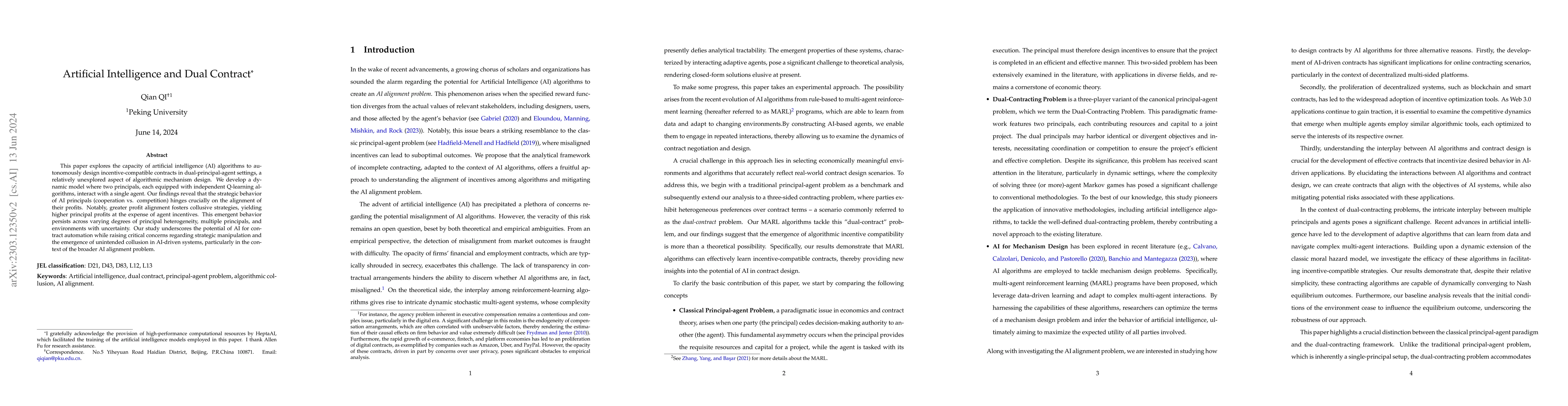 This paper explores the capacity of artificial intelligence (AI) algorithms to autonomously design incentive-compatible contracts in dual-principal-agent settings, a relatively unexplored aspect of algorithmic mechanism design. We develop a dynamic model where two principals, each equipped with independent Q-learning algorithms, interact with a single agent. Our findings reveal that the strategic behavior of AI principals (cooperation vs. competition) hinges crucially on the alignment of their profits. Notably, greater profit alignment fosters collusive strategies, yielding higher principal profits at the expense of agent incentives. This emergent behavior persists across varying degrees of principal heterogeneity, multiple principals, and environments with uncertainty. Our study underscores the potential of AI for contract automation while raising critical concerns regarding strategic manipulation and the emergence of unintended collusion in AI-driven systems, particularly in the context of the broader AI alignment problem.
