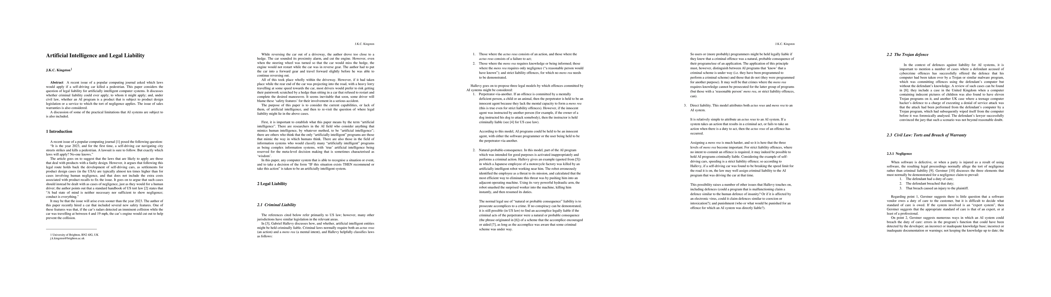 A recent issue of a popular computing journal asked which laws would apply if a self-driving car killed a pedestrian. This paper considers the question of legal liability for artificially intelligent computer systems. It discusses whether criminal liability could ever apply; to whom it might apply; and, under civil law, whether an AI program is a product that is subject to product design legislation or a service to which the tort of negligence applies. The issue of sales warranties is also considered. A discussion of some of the practical limitations that AI systems are subject to is also included.