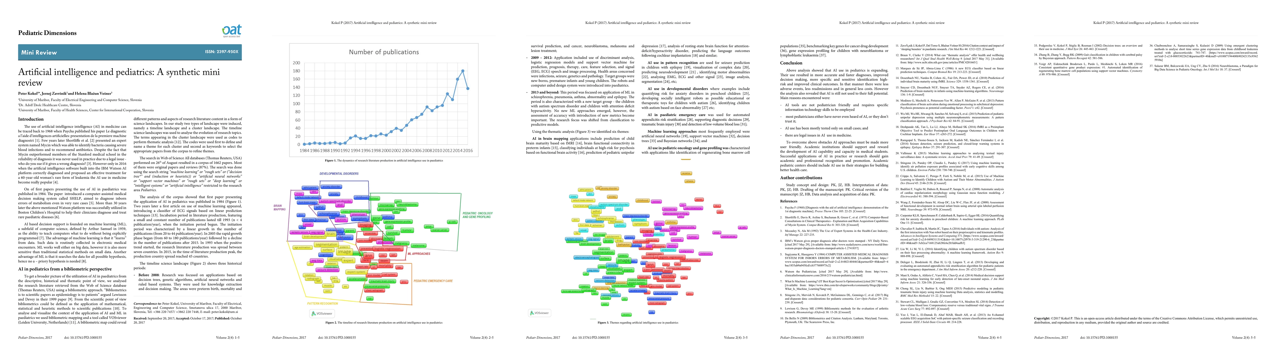 The use of artificial intelligence intelligencein medicine can be traced back to 1968 when Paycha published his paper Le diagnostic a l'aide d'intelligences artificielle, presentation de la premiere machine diagnostri. Few years later Shortliffe et al. presented an expert system named Mycin which was able to identify bacteria causing severe blood infections and to recommend antibiotics. Despite the fact that Mycin outperformed members of the Stanford medical school in the reliability of diagnosis it was never used in practice due to a legal issue who do you sue if it gives a wrong diagnosis?. However only in 2016 when the artificial intelligence software built into the IBM Watson AI platform correctly diagnosed and proposed an effective treatment for a 60-year-old womans rare form of leukemia the AI use in medicine become really popular.On of first papers presenting the use of AI in paediatrics was published in 1984. The paper introduced a computer-assisted medical decision making system called SHELP.