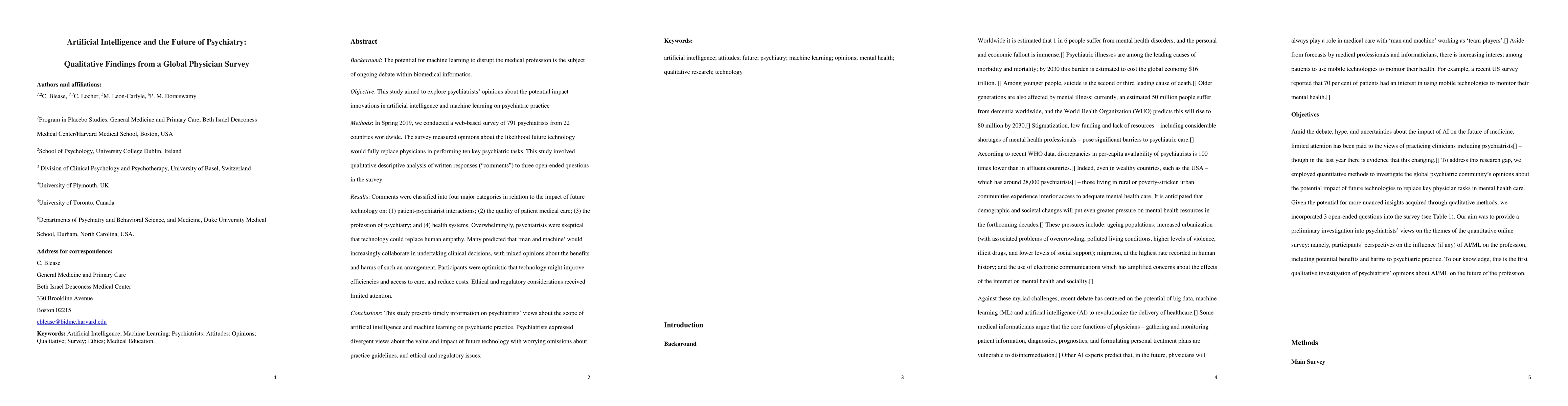 The potential for machine learning to disrupt the medical profession is the subject of ongoing debate within biomedical informatics. This study aimed to explore psychiatrists' opinions about the potential impact of innovations in artificial intelligence and machine learning on psychiatric practice. In Spring 2019, we conducted a web-based survey of 791 psychiatrists from 22 countries worldwide. The survey measured opinions about the likelihood future technology would fully replace physicians in performing ten key psychiatric tasks. This study involved qualitative descriptive analysis of written response to three open-ended questions in the survey. Comments were classified into four major categories in relation to the impact of future technology on patient-psychiatric interactions, the quality of patient medical care, the profession of psychiatry, and health systems. Overwhelmingly, psychiatrists were skeptical that technology could fully replace human empathy. Many predicted that 'man and machine' would increasingly collaborate in undertaking clinical decisions, with mixed opinions about the benefits and harms of such an arrangement. Participants were optimistic that technology might improve efficiencies and access to care, and reduce costs. Ethical and regulatory considerations received limited attention. This study presents timely information of psychiatrists' view about the scope of artificial intelligence and machine learning on psychiatric practice. Psychiatrists expressed divergent views about the value and impact of future technology with worrying omissions about practice guidelines, and ethical and regulatory issues.
