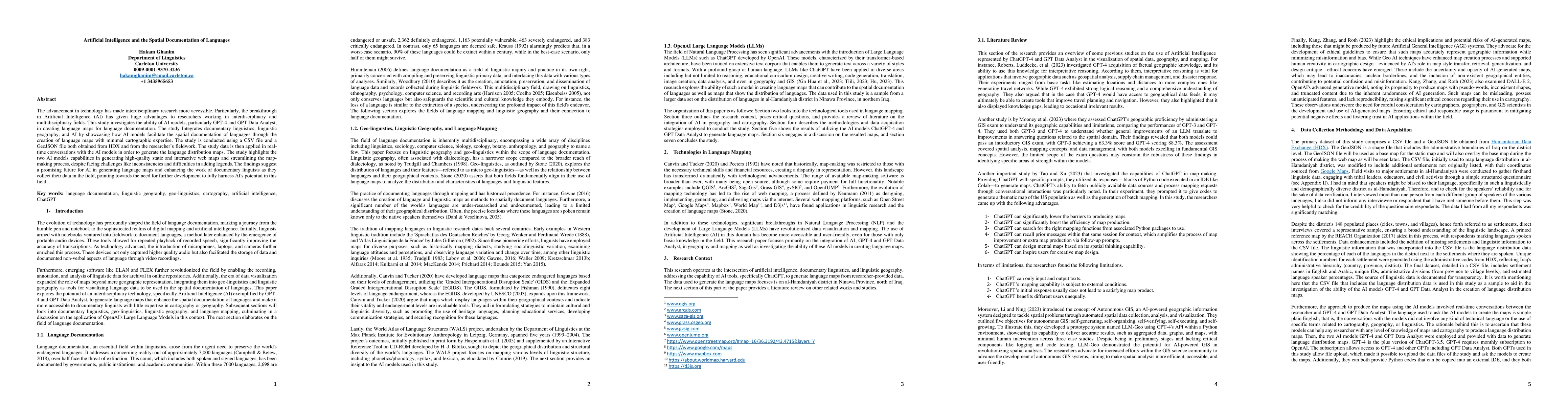 The advancement in technology has made interdisciplinary research more accessible. Particularly the breakthrough in Artificial Intelligence AI has given huge advantages to researchers working in interdisciplinary and multidisciplinary fields. This study investigates the ability of AI models, particularly GPT4 and GPT Data Analyst in creating language maps for language documentation. The study Integrates documentary linguistics linguistic geography and AI by showcasing how AI models facilitate the spatial documentation of languages through the creation of language maps with minimal cartographic expertise. The study is conducted using a CSV file and a GeoJSON file both obtained from HDX and from the researchers fieldwork. The study data is then applied in realtime conversations with the AI models in order to generate the language distribution maps. The study highlights the two AI models capabilities in generating highquality static and interactive web maps and streamlining the mapmaking process, despite facing challenges like inconsistencies and difficulties in adding legends. The findings suggest a promising future for AI in generating language maps and enhancing the work of documentary linguists as they collect their data in the field pointing towards the need for further development to fully harness AI potential in this field.
