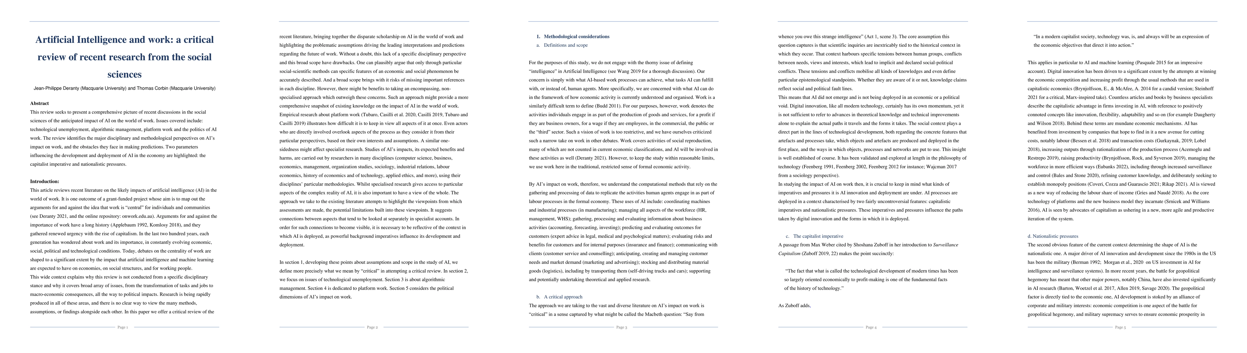 This paper critically reviews recent social science research on AI's anticipated impact on work, covering technological unemployment, algorithmic management, and platform work. It highlights the challenges in predicting AI's effects and emphasizes the capitalist imperative and nationalistic pressures shaping AI's deployment.