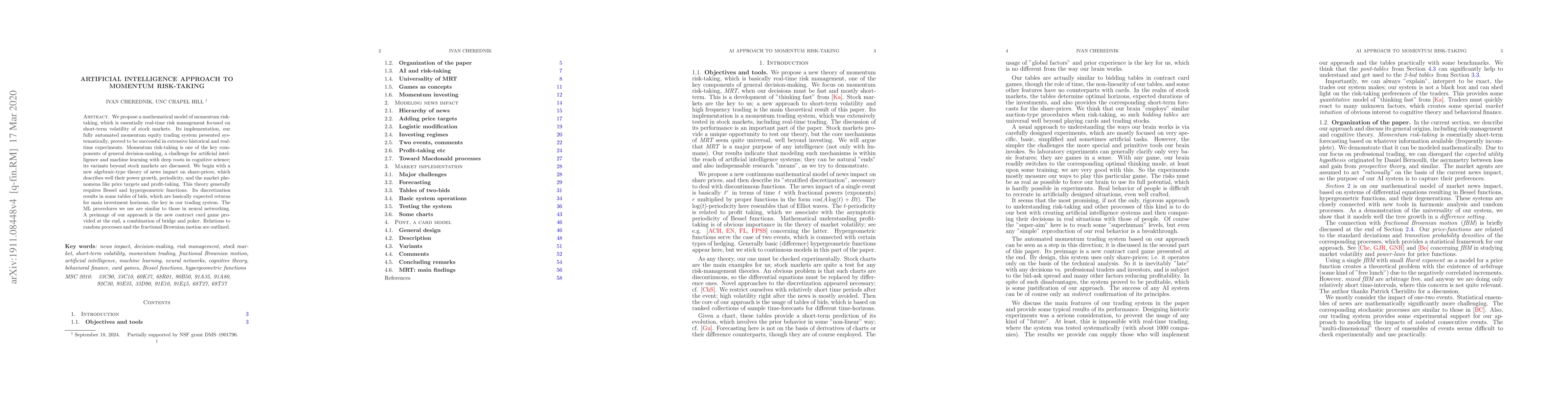 We propose a mathematical model of momentum risk-taking, which is essentially real-time risk management focused on short-term volatility of stock markets. Its implementation, our fully automated momentum equity trading system presented systematically, proved to be successful in extensive historical and real-time experiments. Momentum risk-taking is one of the key components of general decision-making, a challenge for artificial intelligence and machine learning with deep roots in cognitive science; its variants beyond stock markets are discussed. We begin with a new algebraic-type theory of news impact on share-prices, which describes well their power growth, periodicity, and the market phenomena like price targets and profit-taking. This theory generally requires Bessel and hypergeometric functions. Its discretization results in some tables of bids, which are basically expected returns for main investment horizons, the key in our trading system. The ML procedures we use are similar to those in neural networking. A preimage of our approach is the new contract card game provided at the end, a combination of bridge and poker. Relations to random processes and the fractional Brownian motion are outlined.