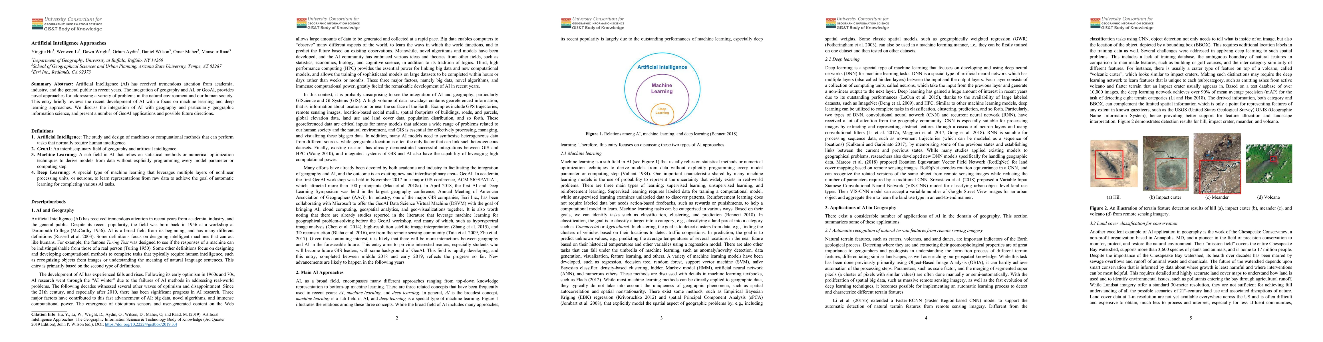 Artificial Intelligence (AI) has received tremendous attention from academia, industry, and the general public in recent years. The integration of geography and AI, or GeoAI, provides novel approaches for addressing a variety of problems in the natural environment and our human society. This entry briefly reviews the recent development of AI with a focus on machine learning and deep learning approaches. We discuss the integration of AI with geography and particularly geographic information science, and present a number of GeoAI applications and possible future directions.