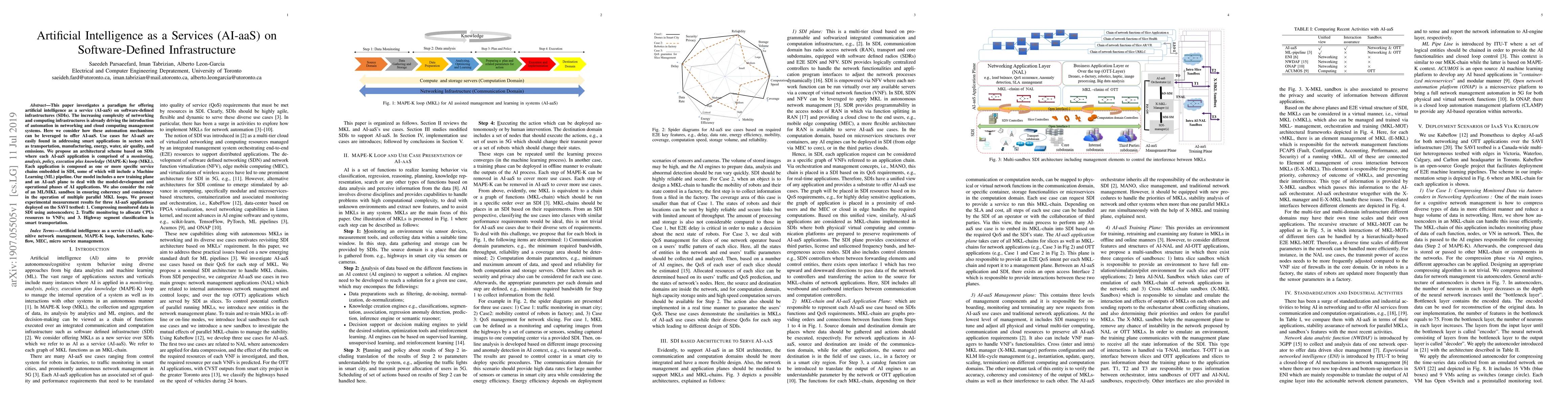 This paper investigates a paradigm for offering artificial intelligence as a service (AI-aaS) on software-defined infrastructures (SDIs). The increasing complexity of networking and computing infrastructures is already driving the introduction of automation in networking and cloud computing management systems. Here we consider how these automation mechanisms can be leveraged to offer AI-aaS. Use cases for AI-aaS are easily found in addressing smart applications in sectors such as transportation, manufacturing, energy, water, air quality, and emissions. We propose an architectural scheme based on SDIs where each AI-aaS application is comprised of a monitoring, analysis, policy, execution plus knowledge (MAPE-K) loop (MKL). Each application is composed as one or more specific service chains embedded in SDI, some of which will include a Machine Learning (ML) pipeline. Our model includes a new training plane and an AI-aaS plane to deal with the model-development and operational phases of AI applications. We also consider the role of an ML/MKL sandbox in ensuring coherency and consistency in the operation of multiple parallel MKL loops. We present experimental measurement results for three AI-aaS applications deployed on the SAVI testbed: 1. Compressing monitored data in SDI using autoencoders; 2. Traffic monitoring to allocate CPUs resources to VNFs; and 3. Highway segment classification in smart transportation.