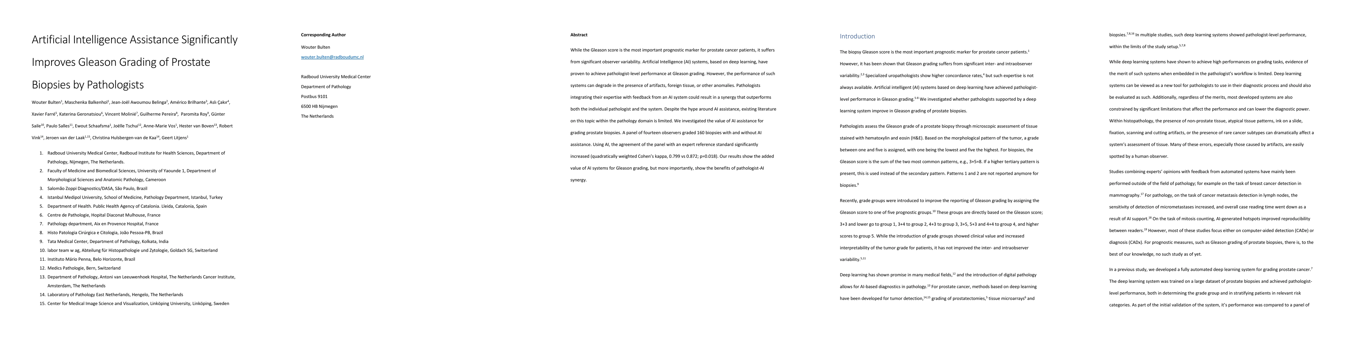 This study demonstrates that artificial intelligence (AI) significantly enhances pathologists' accuracy in Gleason grading of prostate biopsies, with improved agreement when integrating pathologist expertise with AI feedback. The synergy between AI and pathologists outperforms both individual efforts and the AI system alone.