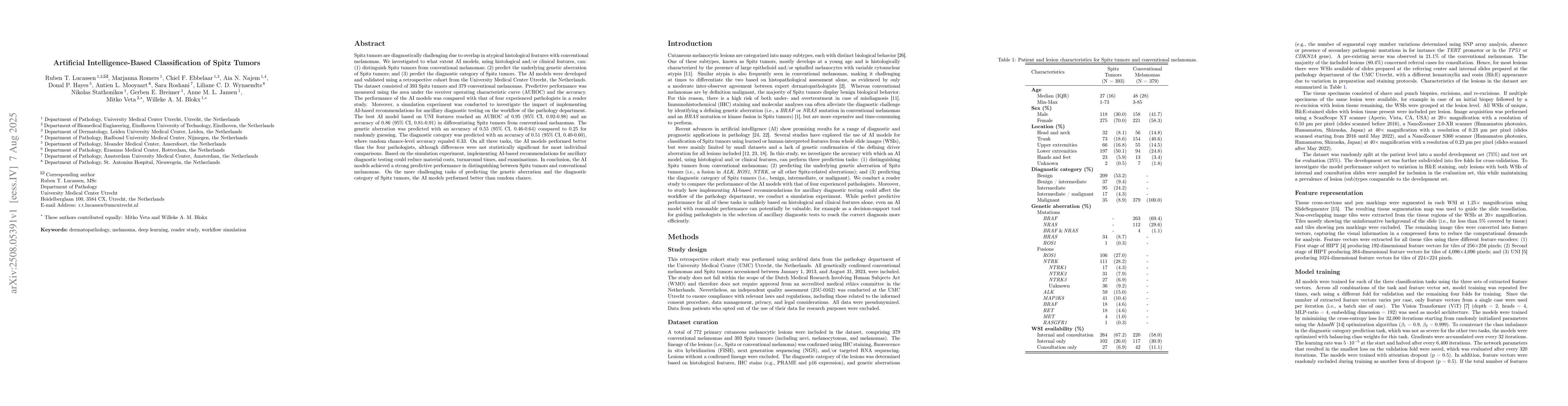 Spitz tumors are diagnostically challenging due to overlap in atypical histological features with conventional melanomas. We investigated to what extent AI models, using histological and/or clinical features, can: (1) distinguish Spitz tumors from conventional melanomas; (2) predict the underlying genetic aberration of Spitz tumors; and (3) predict the diagnostic category of Spitz tumors. The AI models were developed and validated using a dataset of 393 Spitz tumors and 379 conventional melanomas. Predictive performance was measured using the AUROC and the accuracy. The performance of the AI models was compared with that of four experienced pathologists in a reader study. Moreover, a simulation experiment was conducted to investigate the impact of implementing AI-based recommendations for ancillary diagnostic testing on the workflow of the pathology department. The best AI model based on UNI features reached an AUROC of 0.95 and an accuracy of 0.86 in differentiating Spitz tumors from conventional melanomas. The genetic aberration was predicted with an accuracy of 0.55 compared to 0.25 for randomly guessing. The diagnostic category was predicted with an accuracy of 0.51, where random chance-level accuracy equaled 0.33. On all three tasks, the AI models performed better than the four pathologists, although differences were not statistically significant for most individual comparisons. Based on the simulation experiment, implementing AI-based recommendations for ancillary diagnostic testing could reduce material costs, turnaround times, and examinations. In conclusion, the AI models achieved a strong predictive performance in distinguishing between Spitz tumors and conventional melanomas. On the more challenging tasks of predicting the genetic aberration and the diagnostic category of Spitz tumors, the AI models performed better than random chance.