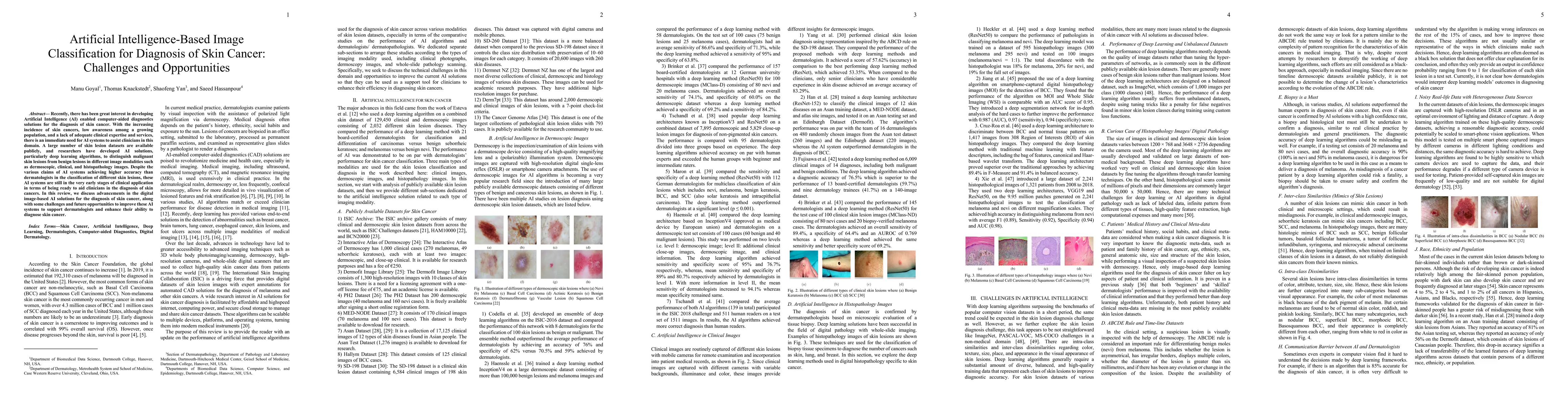 This paper reviews AI-based image classification systems for diagnosing skin cancer, highlighting advancements in deep learning algorithms and challenges in their clinical application, while discussing future opportunities for improvement.