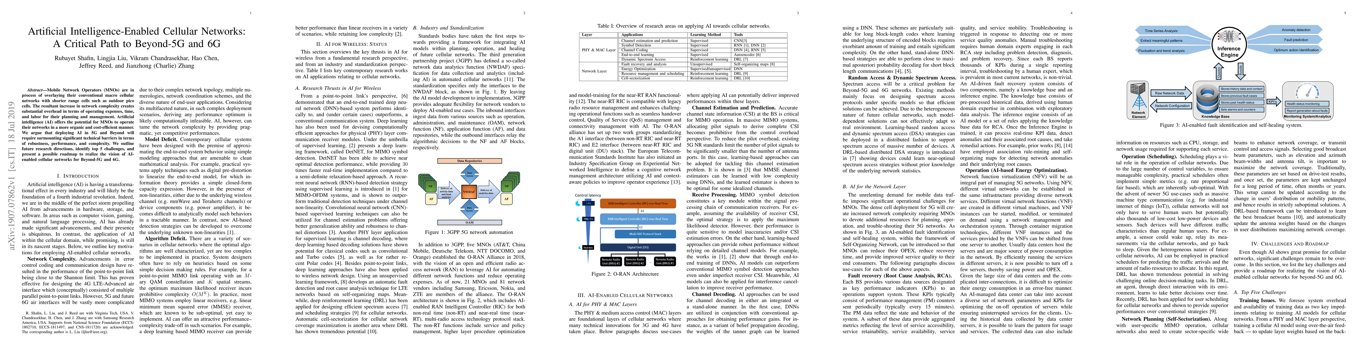 This work stands out by providing a holistic overview of AI applications in cellular networks, addressing both technical and standardization aspects, and highlighting critical challenges and future research directions.