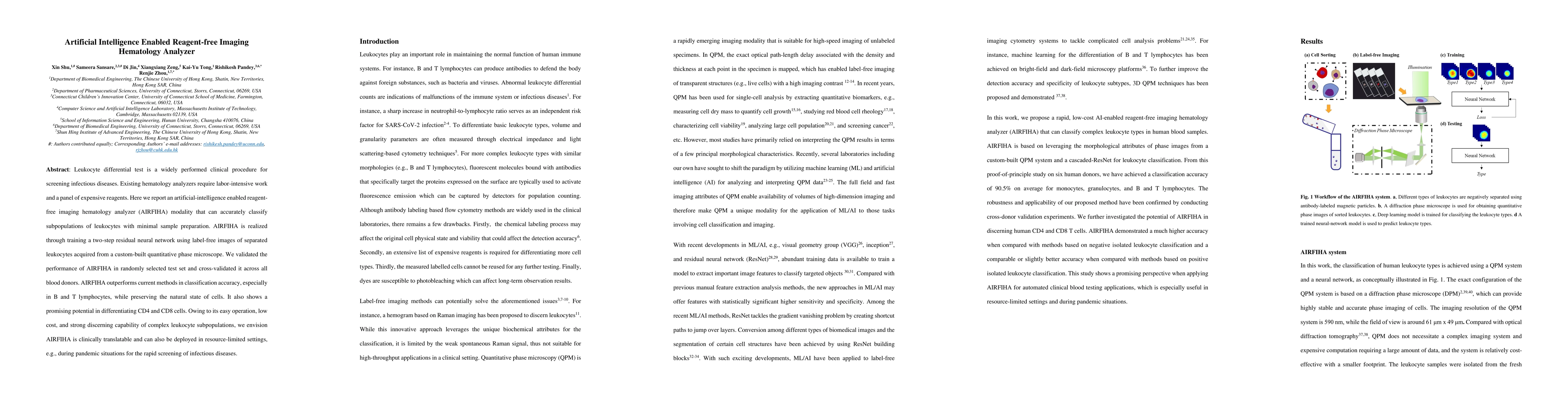 This paper introduces an artificial-intelligence enabled reagent-free imaging hematology analyzer (AIRFIHA) that accurately classifies leukocyte subpopulations using label-free images from a quantitative phase microscope. AIRFIHA outperforms current methods in classification accuracy, especially for B and T lymphocytes, and shows potential in differentiating CD4 and CD8 cells, making it a cost-effective and easy-to-use tool for rapid infectious disease screening.