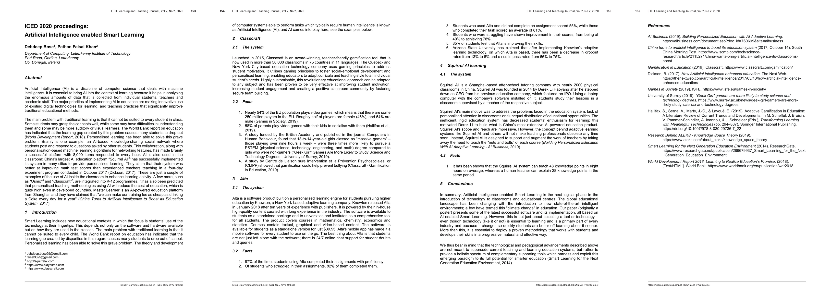 Artificial Intelligence (AI) is a discipline of computer science that deals with machine intelligence. It is essential to bring AI into the context of learning because it helps in analysing the enormous amounts of data that is collected from individual students, teachers and academic staff. The major priorities of implementing AI in education are making innovative use of existing digital technologies for learning, and teaching practices that significantly improve traditional educational methods. The main problem with traditional learning is that it cannot be suited to every student in class. Some students may grasp the concepts well, while some may have difficulties in understanding them and some may be more auditory or visual learners. The World Bank report on education has indicated that the learning gap created by this problem causes many students to drop out (World Development Report, 2018). Personalised learning has been able to solve this grave problem.