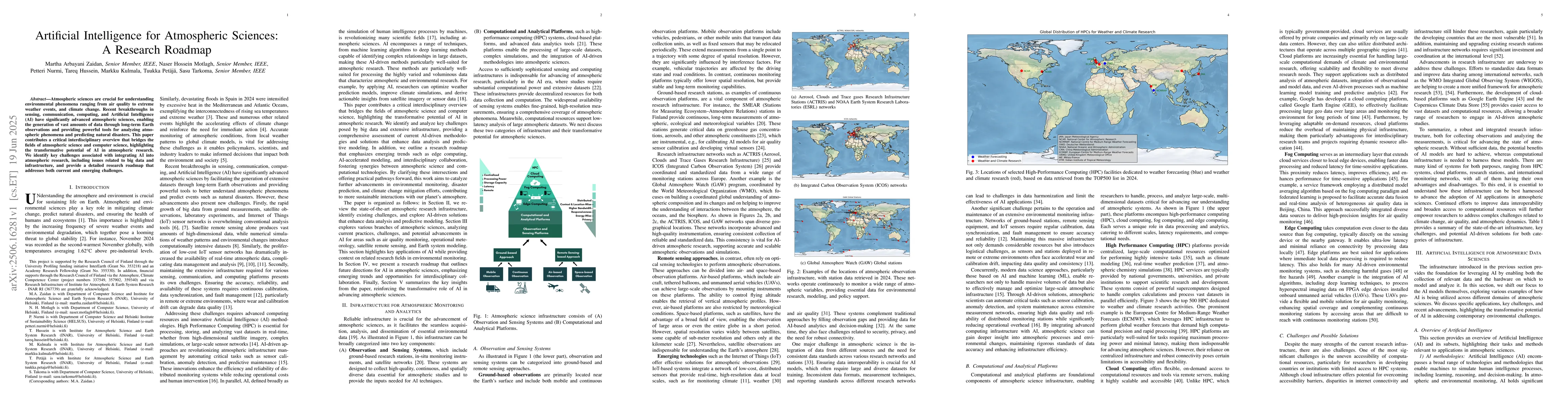 Atmospheric sciences are crucial for understanding environmental phenomena ranging from air quality to extreme weather events, and climate change. Recent breakthroughs in sensing, communication, computing, and Artificial Intelligence (AI) have significantly advanced atmospheric sciences, enabling the generation of vast amounts of data through long-term Earth observations and providing powerful tools for analyzing atmospheric phenomena and predicting natural disasters. This paper contributes a critical interdisciplinary overview that bridges the fields of atmospheric science and computer science, highlighting the transformative potential of AI in atmospheric research. We identify key challenges associated with integrating AI into atmospheric research, including issues related to big data and infrastructure, and provide a detailed research roadmap that addresses both current and emerging challenges.
