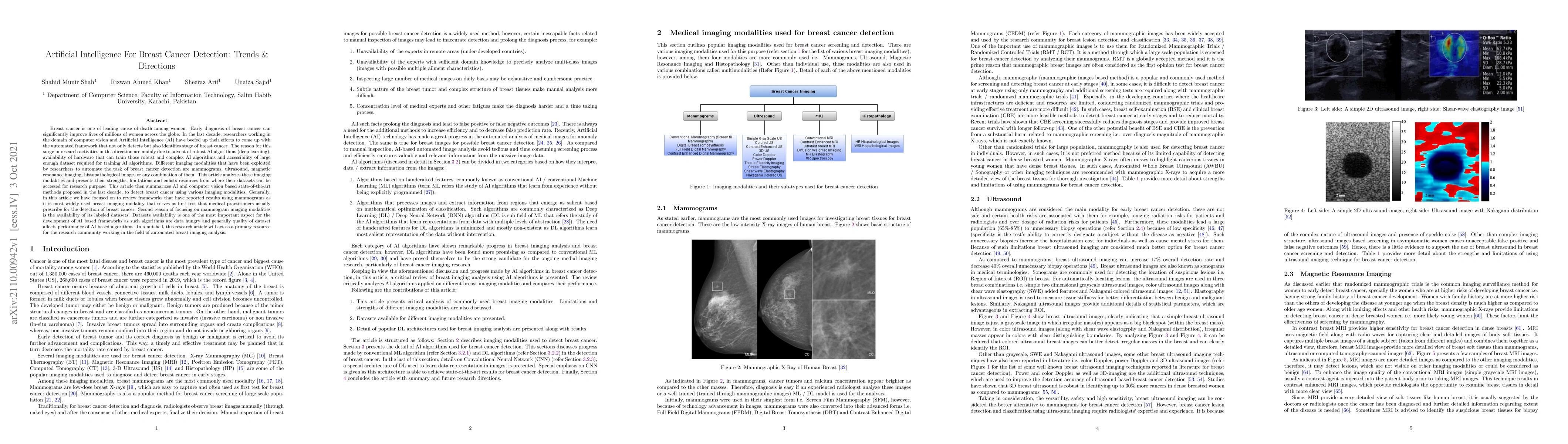 In the last decade, researchers working in the domain of computer vision and Artificial Intelligence (AI) have beefed up their efforts to come up with the automated framework that not only detects but also identifies stage of breast cancer. The reason for this surge in research activities in this direction are mainly due to advent of robust AI algorithms (deep learning), availability of hardware that can train those robust and complex AI algorithms and accessibility of large enough dataset required for training AI algorithms. Different imaging modalities that have been exploited by researchers to automate the task of breast cancer detection are mammograms, ultrasound, magnetic resonance imaging, histopathological images or any combination of them. This article analyzes these imaging modalities and presents their strengths, limitations and enlists resources from where their datasets can be accessed for research purpose. This article then summarizes AI and computer vision based state-of-the-art methods proposed in the last decade, to detect breast cancer using various imaging modalities. Generally, in this article we have focused on to review frameworks that have reported results using mammograms as it is most widely used breast imaging modality that serves as first test that medical practitioners usually prescribe for the detection of breast cancer. Second reason of focusing on mammogram imaging modalities is the availability of its labeled datasets. Datasets availability is one of the most important aspect for the development of AI based frameworks as such algorithms are data hungry and generally quality of dataset affects performance of AI based algorithms. In a nutshell, this research article will act as a primary resource for the research community working in the field of automated breast imaging analysis.