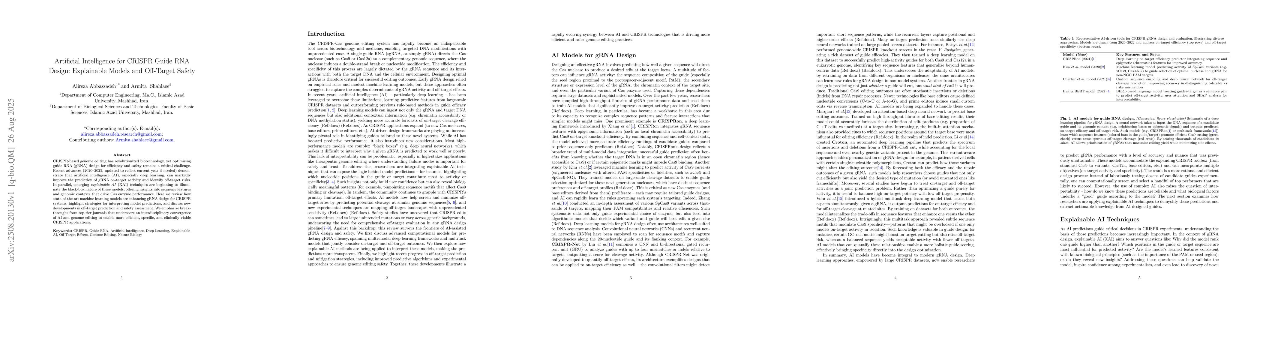 CRISPR-based genome editing has revolutionized biotechnology, yet optimizing guide RNA (gRNA) design for efficiency and safety remains a critical challenge. Recent advances (2020--2025, updated to reflect current year if needed) demonstrate that artificial intelligence (AI), especially deep learning, can markedly improve the prediction of gRNA on-target activity and identify off-target risks. In parallel, emerging explainable AI (XAI) techniques are beginning to illuminate the black-box nature of these models, offering insights into sequence features and genomic contexts that drive Cas enzyme performance. Here we review how state-of-the-art machine learning models are enhancing gRNA design for CRISPR systems, highlight strategies for interpreting model predictions, and discuss new developments in off-target prediction and safety assessment. We emphasize breakthroughs from top-tier journals that underscore an interdisciplinary convergence of AI and genome editing to enable more efficient, specific, and clinically viable CRISPR applications.
