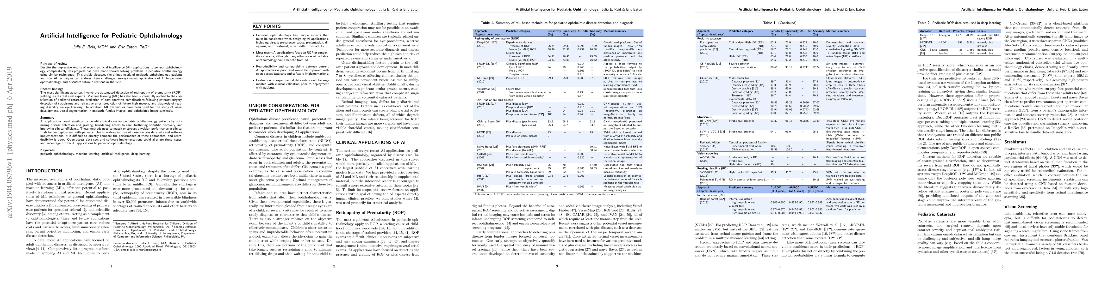 PURPOSE OF REVIEW: Despite the impressive results of recent artificial intelligence (AI) applications to general ophthalmology, comparatively less progress has been made toward solving problems in pediatric ophthalmology using similar techniques. This article discusses the unique needs of pediatric ophthalmology patients and how AI techniques can address these challenges, surveys recent applications of AI to pediatric ophthalmology, and discusses future directions in the field. RECENT FINDINGS: The most significant advances involve the automated detection of retinopathy of prematurity (ROP), yielding results that rival experts. Machine learning (ML) has also been successfully applied to the classification of pediatric cataracts, prediction of post-operative complications following cataract surgery, detection of strabismus and refractive error, prediction of future high myopia, and diagnosis of reading disability via eye tracking. In addition, ML techniques have been used for the study of visual development, vessel segmentation in pediatric fundus images, and ophthalmic image synthesis. SUMMARY: AI applications could significantly benefit clinical care for pediatric ophthalmology patients by optimizing disease detection and grading, broadening access to care, furthering scientific discovery, and improving clinical efficiency. These methods need to match or surpass physician performance in clinical trials before deployment with patients. Due to widespread use of closed-access data sets and software implementations, it is difficult to directly compare the performance of these approaches, and reproducibility is poor. Open-access data sets and software implementations could alleviate these issues, and encourage further AI applications to pediatric ophthalmology. KEYWORDS: pediatric ophthalmology, machine learning, artificial intelligence, deep learning
