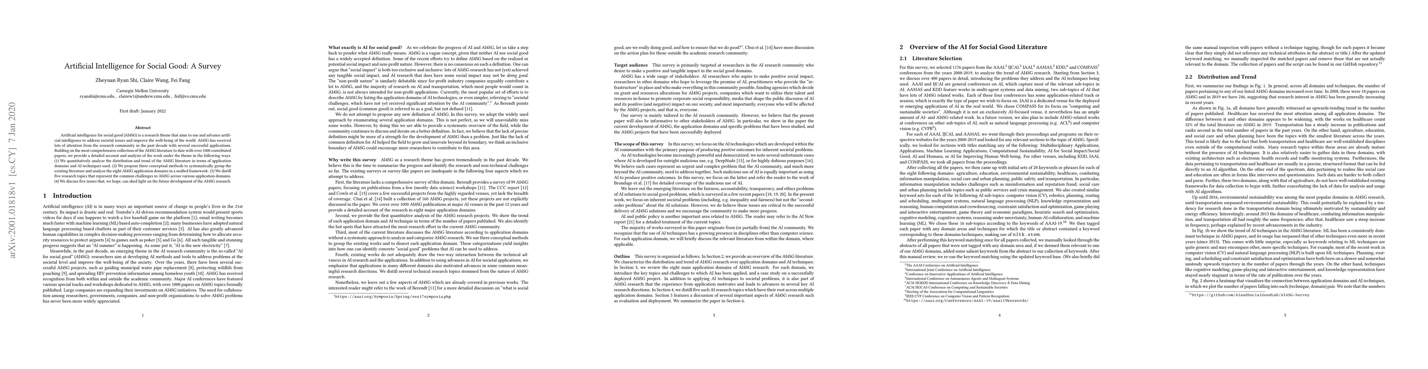 This paper surveys the field of Artificial Intelligence for Social Good (AI4SG), analyzing over 1000 papers to identify trends, categorize application domains, and highlight common challenges and future directions for AI4SG research. It proposes a framework to systematically group literature and discusses five research topics and issues for future development.