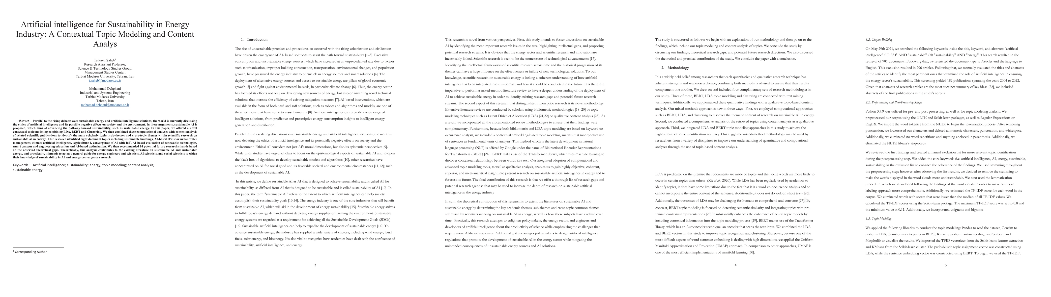 This paper employs a novel contextual topic modeling combining LDA, BERT, and clustering to analyze scientific publications on sustainable AI in energy. It identifies eight main topics and recommends 14 potential future research directions, aiming to guide energy engineers, AI scientists, and social scientists in sustainability research.