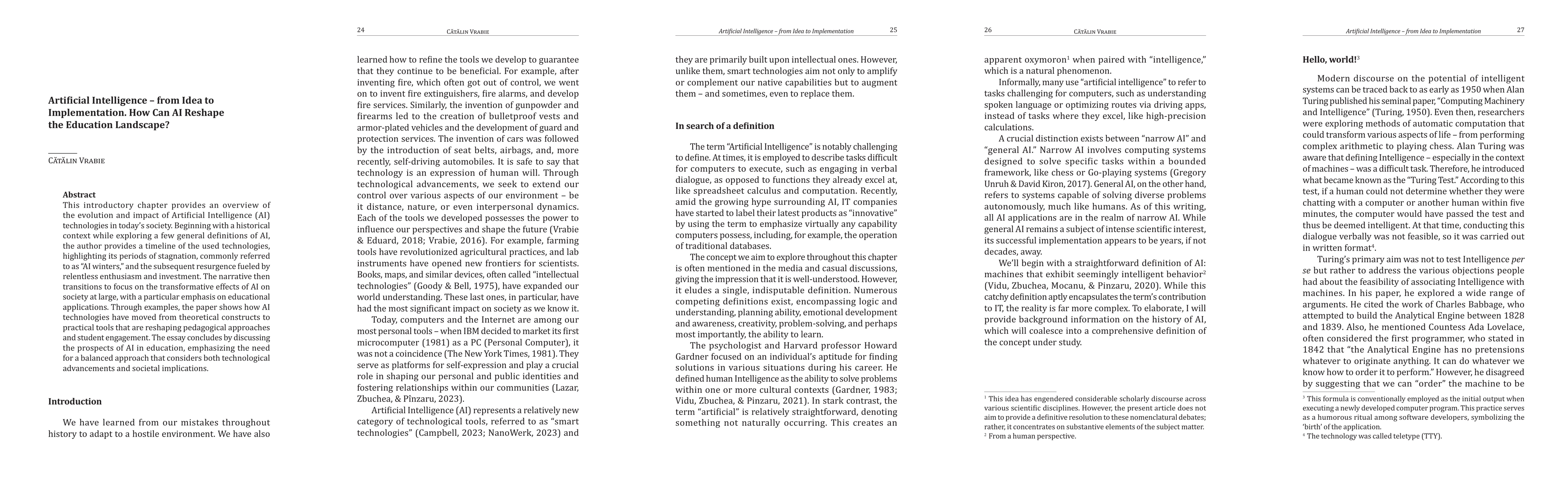 This introductory chapter provides an overview of the evolution and impact of Artificial Intelligence technologies in today society. Beginning with a historical context while exploring a few general definitions of AI, the author provides a timeline of the used technologies, highlighting its periods of stagnation, commonly referred to as AI winters, and the subsequent resurgence fueled by relentless enthusiasm and investment. The narrative then transitions to focus on the transformative effects of AI on society at large, with a particular emphasis on educational applications. Through examples, the paper shows how AI technologies have moved from theoretical constructs to practical tools that are reshaping pedagogical approaches and student engagement. The essay concludes by discussing the prospects of AI in education, emphasizing the need for a balanced approach that considers both technological advancements and societal implications.