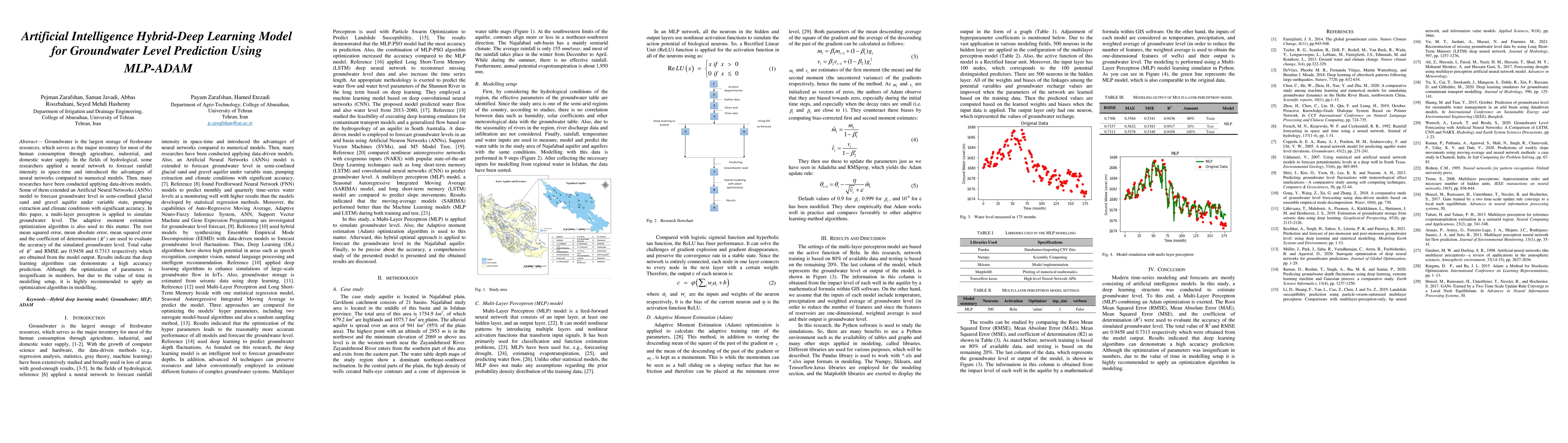 This paper proposes a hybrid deep learning model using a multi-layer perceptron (MLP) with the adaptive moment estimation (ADAM) optimization algorithm to predict groundwater levels. The model demonstrates high accuracy, with an R² of 0.9458 and RMSE of 0.7313, indicating deep learning's potential in hydrological forecasting.