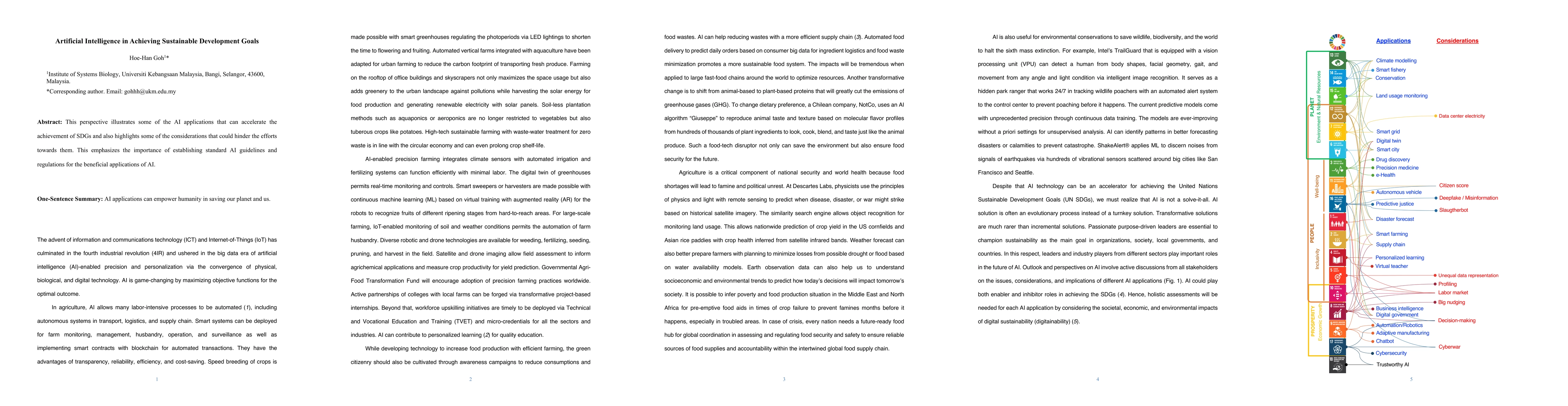 This perspective illustrates some of the AI applications that can accelerate the achievement of SDGs and also highlights some of the considerations that could hinder the efforts towards them. This emphasizes the importance of establishing standard AI guidelines and regulations for the beneficial applications of AI.