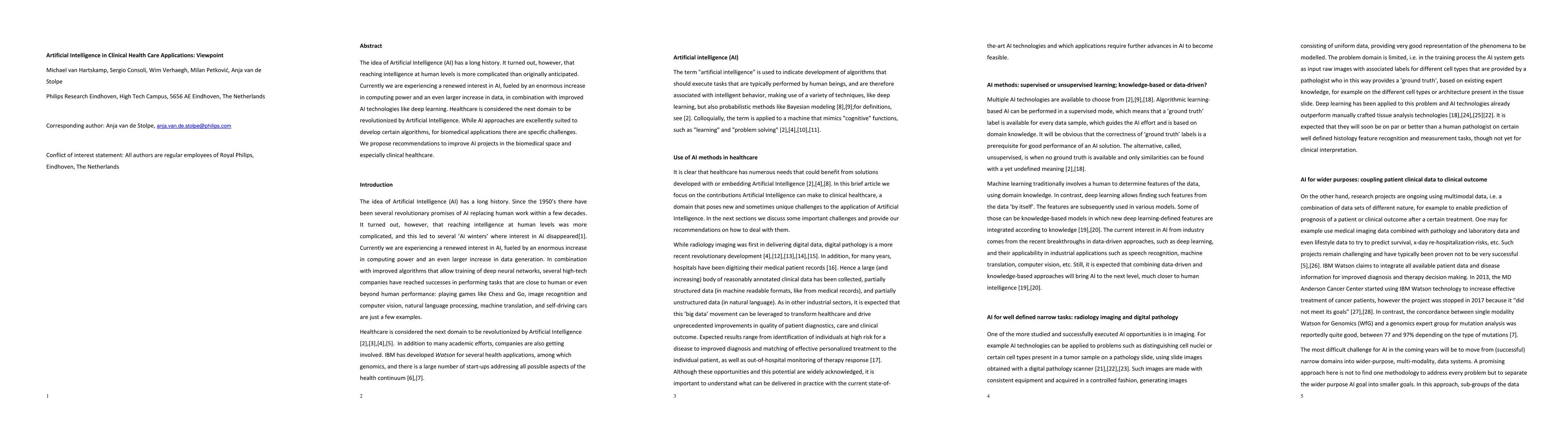 The idea of Artificial Intelligence (AI) has a long history. It turned out, however, that reaching intelligence at human levels is more complicated than originally anticipated. Currently we are experiencing a renewed interest in AI, fueled by an enormous increase in computing power and an even larger increase in data, in combination with improved AI technologies like deep learning. Healthcare is considered the next domain to be revolutionized by Artificial Intelligence. While AI approaches are excellently suited to develop certain algorithms, for biomedical applications there are specific challenges. We propose recommendations to improve AI projects in the biomedical space and especially clinical healthcare.