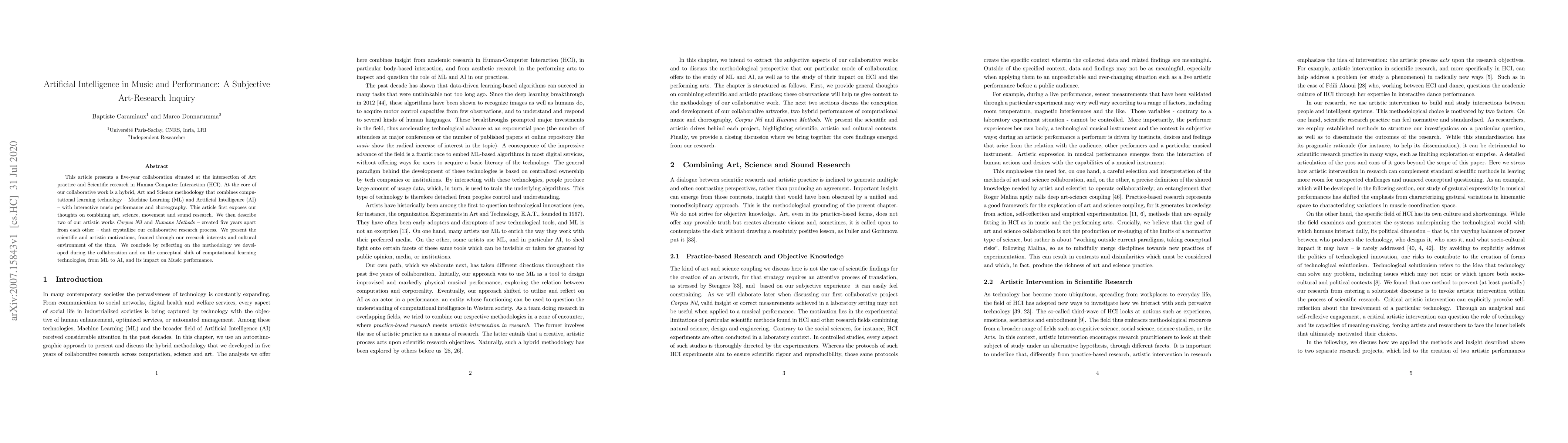 This paper explores a five-year collaboration blending art and scientific research in Human-Computer Interaction, focusing on the integration of AI and ML in music performance and choreography. It details two artistic projects, \textit{Corpus Nil} and \textit{Humane Methods}, and reflects on the evolving methodology and the shift from ML to AI in music.