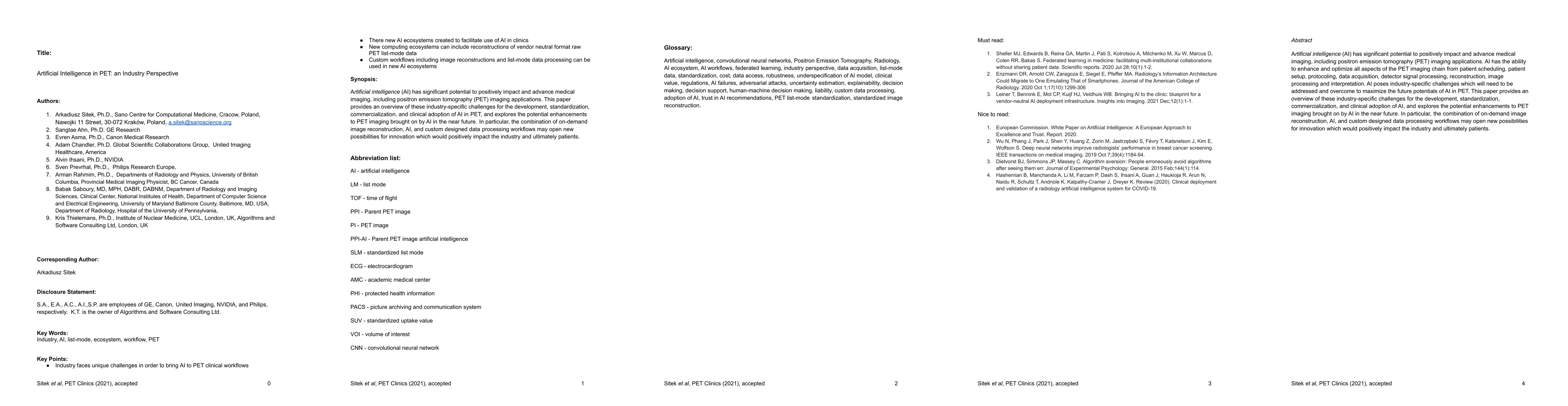 This paper explores the transformative potential of artificial intelligence (AI) in positron emission tomography (PET) imaging, highlighting its benefits across the entire imaging process and addressing industry-specific challenges for its successful implementation and adoption. The paper also discusses how AI-driven innovations could revolutionize PET imaging and improve patient outcomes.