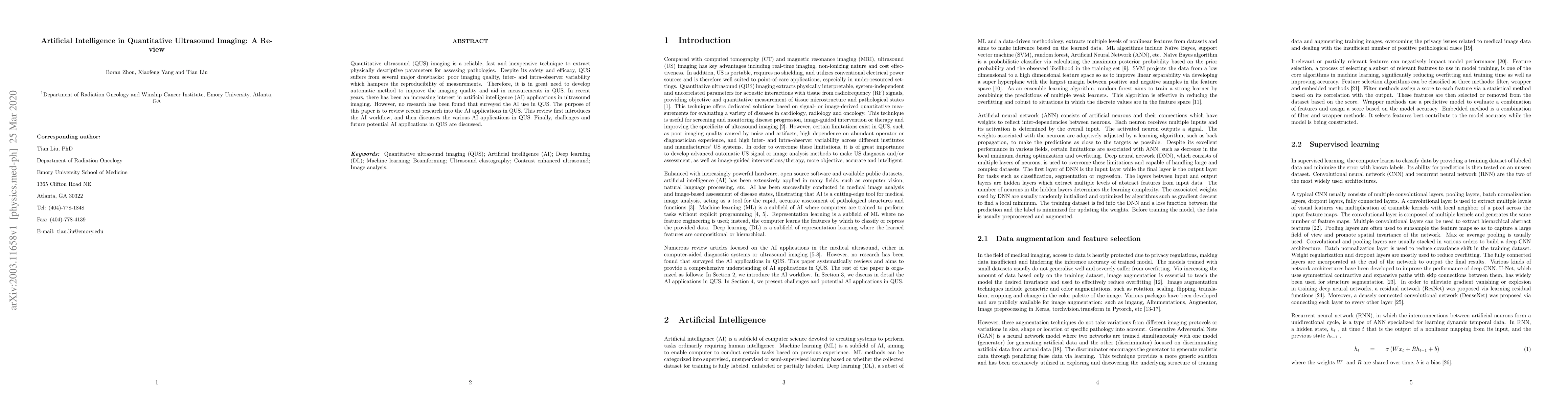 This paper reviews recent advances in artificial intelligence (AI) applications to improve quantitative ultrasound (QUS) imaging, addressing issues like poor imaging quality and variability in measurements. It discusses AI workflow and various AI methods used in QUS, along with challenges and future directions.