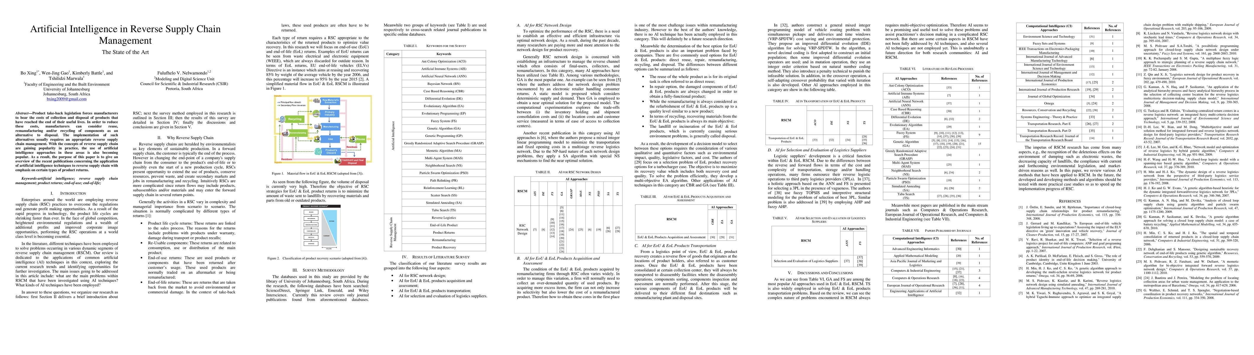 This paper provides an overview of recent research on using artificial intelligence techniques to enhance reverse supply chain management, focusing on strategies for reuse, remanufacturing, and recycling of end-of-life products. It highlights the growing trend of integrating AI to optimize product take-back processes and reduce associated costs.