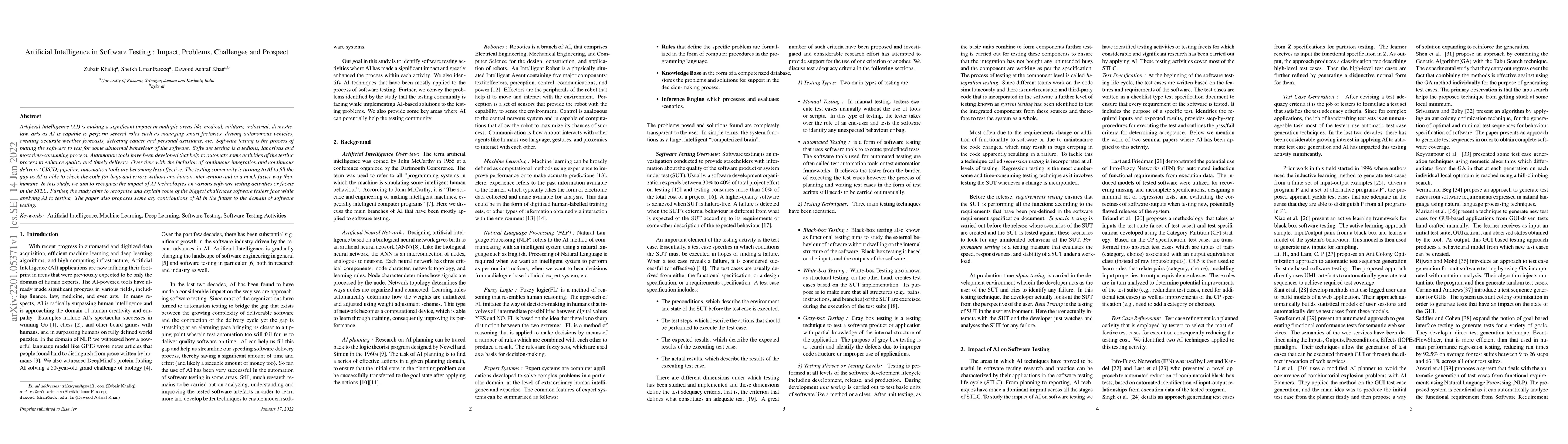 This paper examines the impact of Artificial Intelligence (AI) on software testing, highlighting its potential to automate and enhance testing processes. It also discusses the challenges faced by testers in implementing AI and proposes future contributions of AI in improving software testing efficiency.