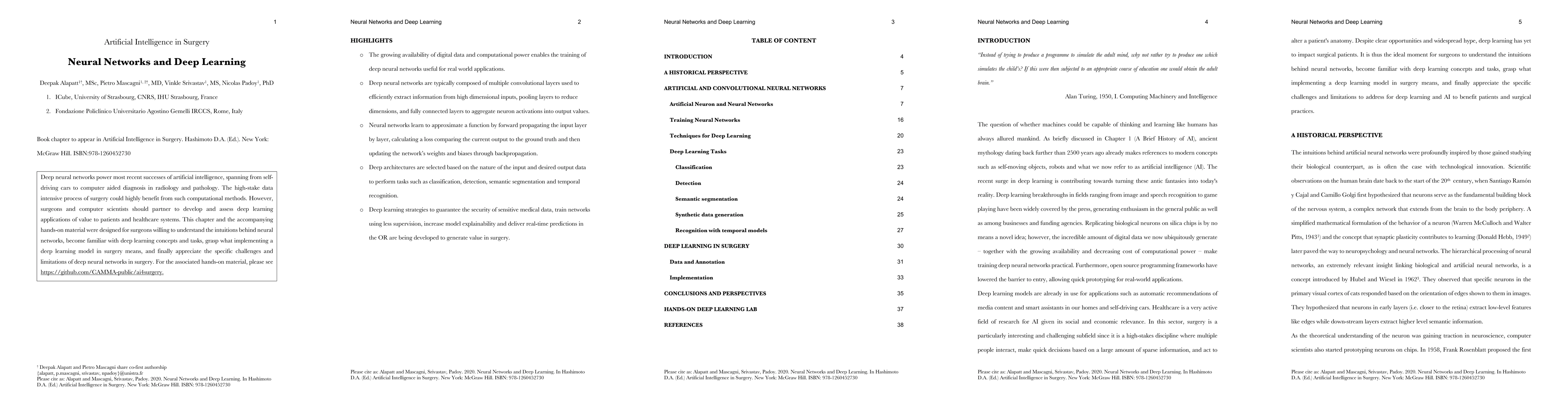 Deep neural networks power most recent successes of artificial intelligence, spanning from self-driving cars to computer aided diagnosis in radiology and pathology. The high-stake data intensive process of surgery could highly benefit from such computational methods. However, surgeons and computer scientists should partner to develop and assess deep learning applications of value to patients and healthcare systems. This chapter and the accompanying hands-on material were designed for surgeons willing to understand the intuitions behind neural networks, become familiar with deep learning concepts and tasks, grasp what implementing a deep learning model in surgery means, and finally appreciate the specific challenges and limitations of deep neural networks in surgery. For the associated hands-on material, please see https://github.com/CAMMA-public/ai4surgery.