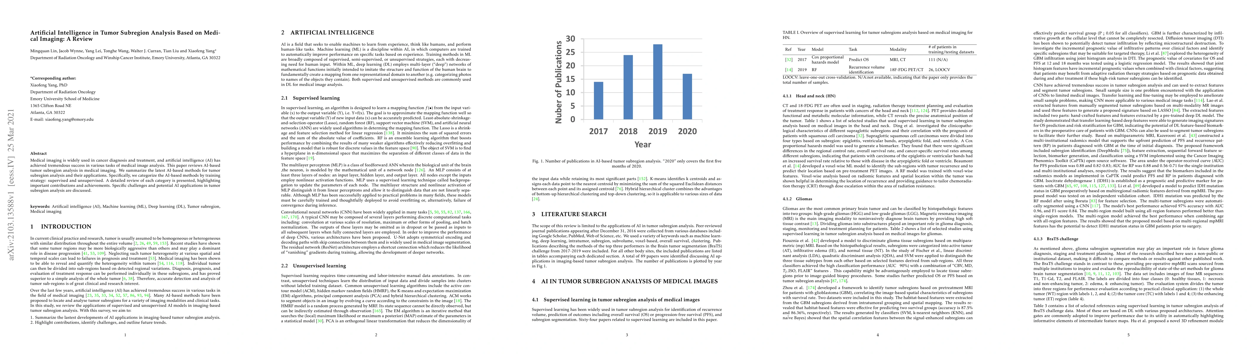 This paper reviews AI-based methods for tumor subregion analysis in medical imaging, categorizing them by training strategy: supervised and unsupervised. It discusses specific challenges and potential AI applications in this field.