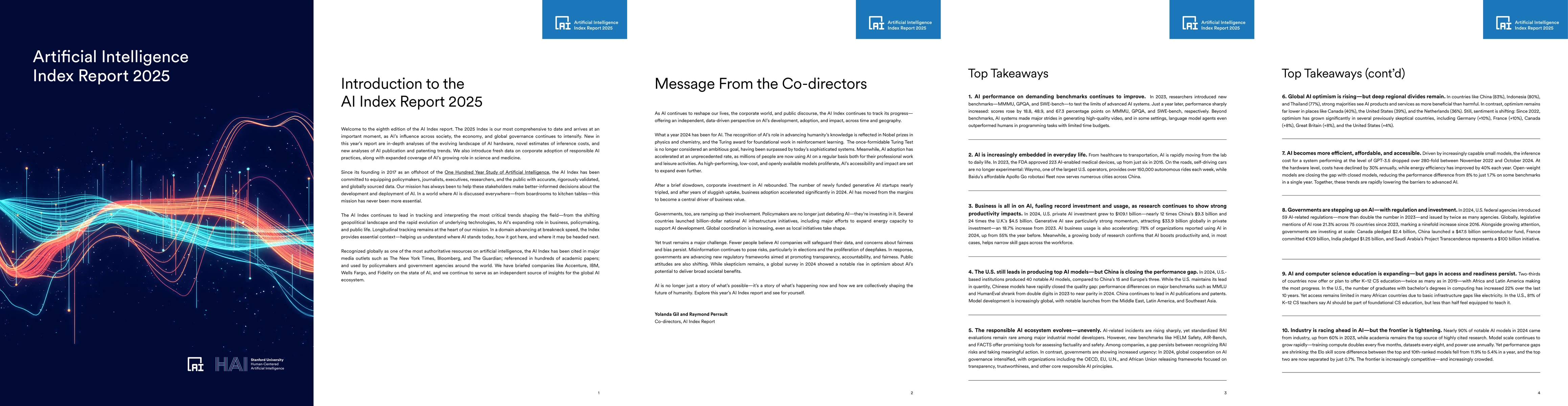 Welcome to the eighth edition of the AI Index report. The 2025 Index is our most comprehensive to date and arrives at an important moment, as AI's influence across society, the economy, and global governance continues to intensify. New in this year's report are in-depth analyses of the evolving landscape of AI hardware, novel estimates of inference costs, and new analyses of AI publication and patenting trends. We also introduce fresh data on corporate adoption of responsible AI practices, along with expanded coverage of AI's growing role in science and medicine. Since its founding in 2017 as an offshoot of the One Hundred Year Study of Artificial Intelligence, the AI Index has been committed to equipping policymakers, journalists, executives, researchers, and the public with accurate, rigorously validated, and globally sourced data. Our mission has always been to help these stakeholders make better-informed decisions about the development and deployment of AI. In a world where AI is discussed everywhere - from boardrooms to kitchen tables - this mission has never been more essential. The AI Index continues to lead in tracking and interpreting the most critical trends shaping the field - from the shifting geopolitical landscape and the rapid evolution of underlying technologies, to AI's expanding role in business, policymaking, and public life. Longitudinal tracking remains at the heart of our mission. In a domain advancing at breakneck speed, the Index provides essential context - helping us understand where AI stands today, how it got here, and where it may be headed next. Recognized globally as one of the most authoritative resources on artificial intelligence, the AI Index has been cited in major media outlets such as The New York Times, Bloomberg, and The Guardian; referenced in hundreds of academic papers; and used by policymakers and government agencies around the world.