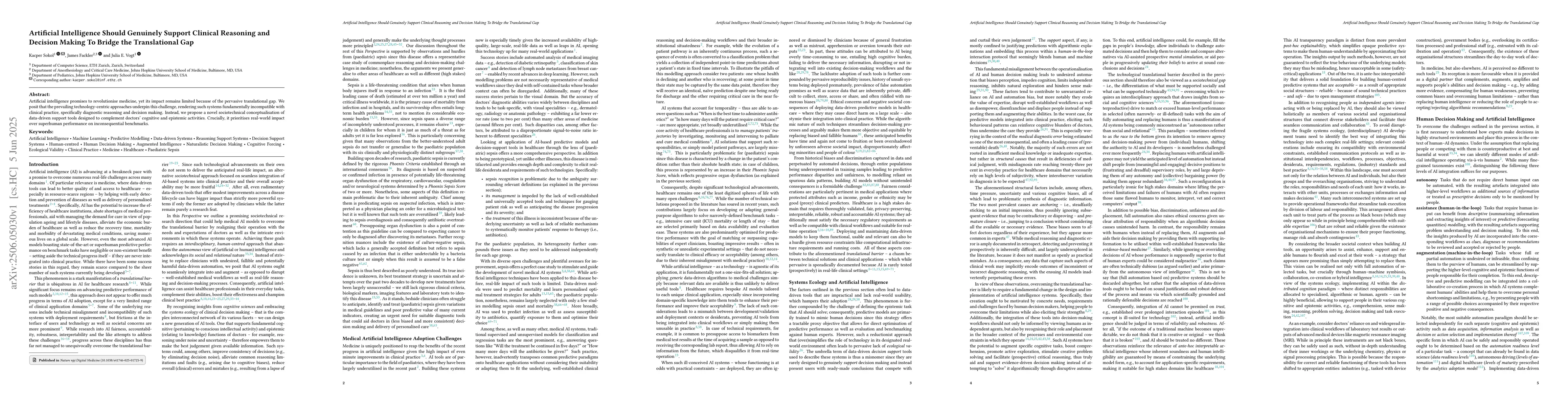 AI systems should prioritize supporting clinical decision-making over perfect performance to bridge the translational gap in medicine. A new approach focuses on real-world impact over benchmarks, complementing doctors' cognitive activities.
