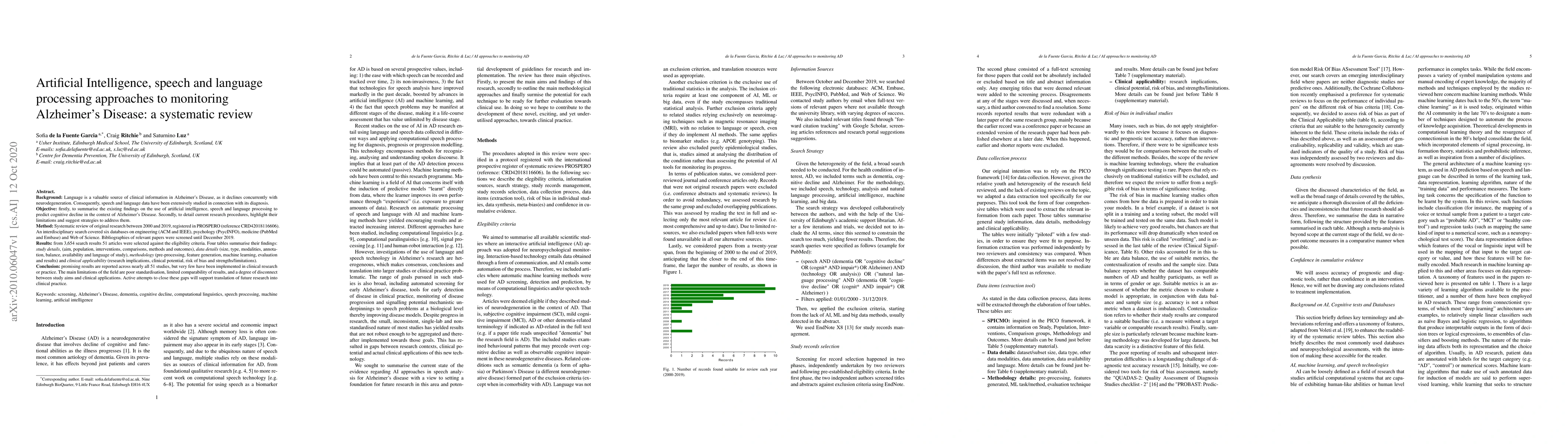 Language is a valuable source of clinical information in Alzheimer's Disease, as it declines concurrently with neurodegeneration. Consequently, speech and language data have been extensively studied in connection with its diagnosis. This paper summarises current findings on the use of artificial intelligence, speech and language processing to predict cognitive decline in the context of Alzheimer's Disease, detailing current research procedures, highlighting their limitations and suggesting strategies to address them. We conducted a systematic review of original research between 2000 and 2019, registered in PROSPERO (reference CRD42018116606). An interdisciplinary search covered six databases on engineering (ACM and IEEE), psychology (PsycINFO), medicine (PubMed and Embase) and Web of Science. Bibliographies of relevant papers were screened until December 2019. From 3,654 search results 51 articles were selected against the eligibility criteria. Four tables summarise their findings: study details (aim, population, interventions, comparisons, methods and outcomes), data details (size, type, modalities, annotation, balance, availability and language of study), methodology (pre-processing, feature generation, machine learning, evaluation and results) and clinical applicability (research implications, clinical potential, risk of bias and strengths/limitations). While promising results are reported across nearly all 51 studies, very few have been implemented in clinical research or practice. We concluded that the main limitations of the field are poor standardisation, limited comparability of results, and a degree of disconnect between study aims and clinical applications. Attempts to close these gaps should support translation of future research into clinical practice.