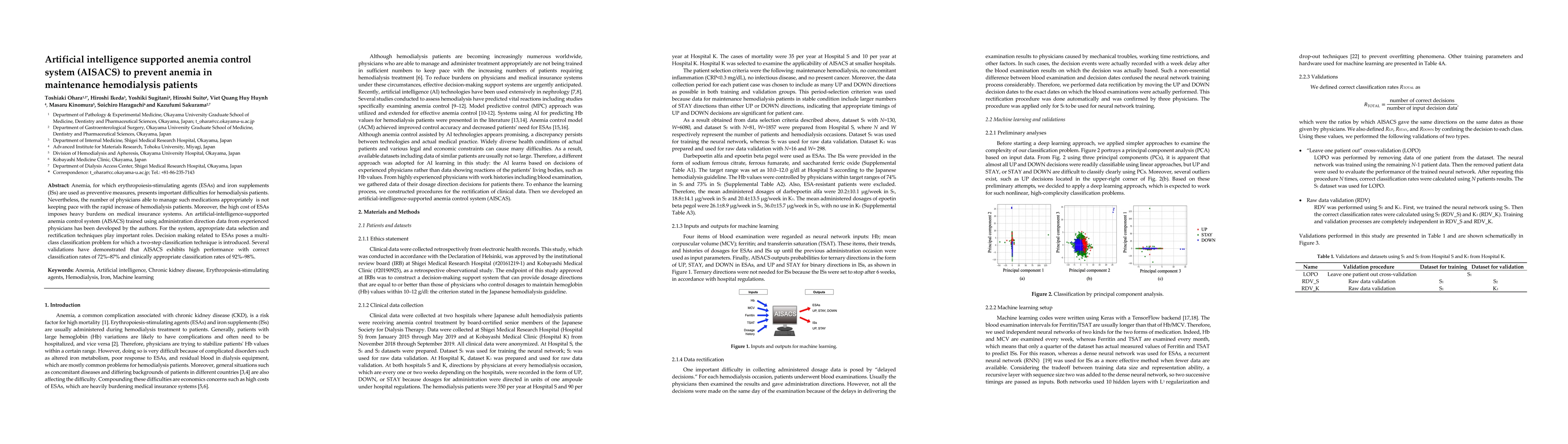 The paper introduces an artificial intelligence-supported anemia control system (AISACS) to manage anemia in hemodialysis patients, demonstrating high performance in medication classification with correct rates of 72-87% and appropriate clinical decisions at 92-98%. The system aims to alleviate the burden on physicians and reduce costs associated with erythropoiesis-stimulating agents.