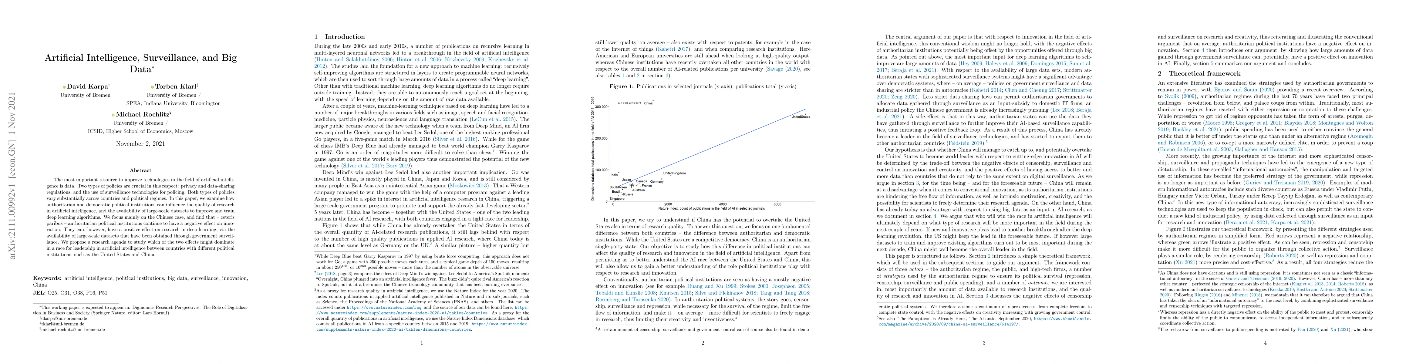 The most important resource to improve technologies in the field of artificial intelligence is data. Two types of policies are crucial in this respect: privacy and data-sharing regulations, and the use of surveillance technologies for policing. Both types of policies vary substantially across countries and political regimes. In this chapter, we examine how authoritarian and democratic political institutions can influence the quality of research in artificial intelligence, and the availability of large-scale datasets to improve and train deep learning algorithms. We focus mainly on the Chinese case, and find that -- ceteris paribus -- authoritarian political institutions continue to have a negative effect on innovation. They can, however, have a positive effect on research in deep learning, via the availability of large-scale datasets that have been obtained through government surveillance. We propose a research agenda to study which of the two effects might dominate in a race for leadership in artificial intelligence between countries with different political institutions, such as the United States and China.