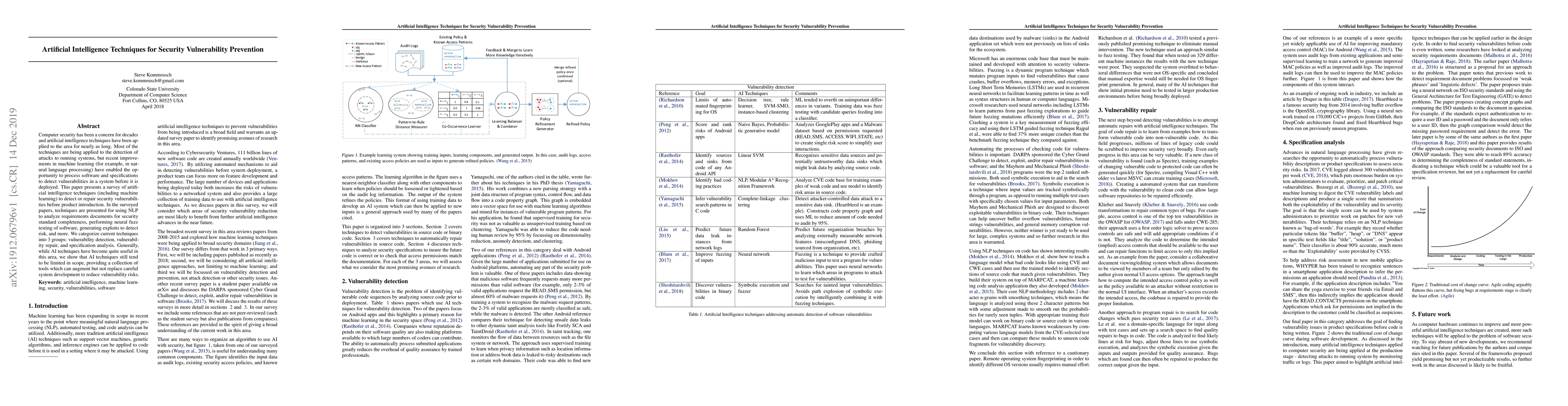 This paper surveys artificial intelligence techniques, including machine learning, for detecting and repairing security vulnerabilities before system deployment. The techniques are categorized into vulnerability detection, repair, and specification analysis, but the paper concludes that while useful, AI tools cannot fully replace traditional system development practices.