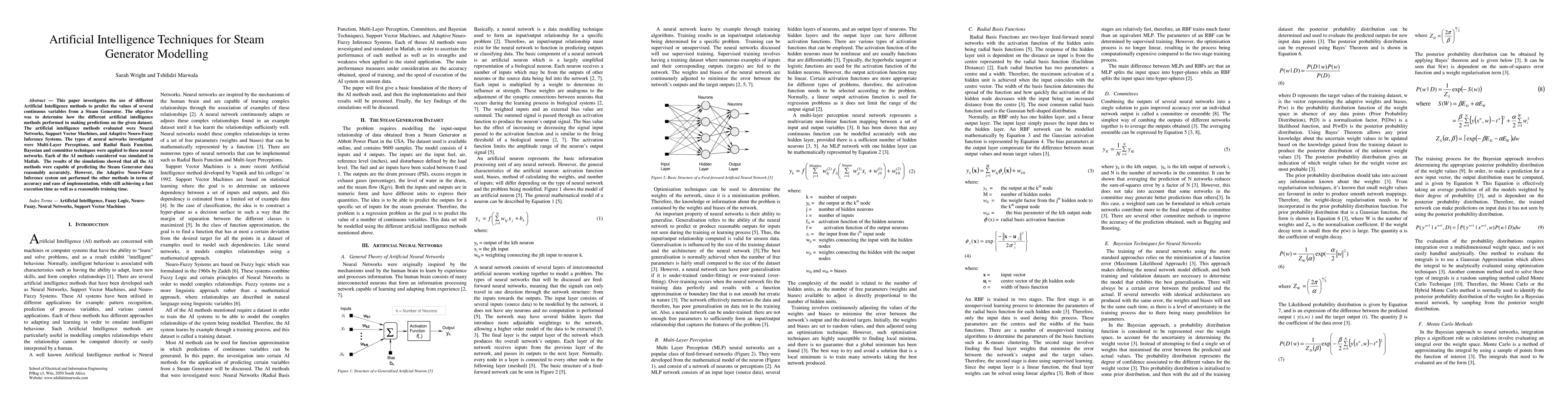 This paper investigates the use of different Artificial Intelligence methods to predict the values of several continuous variables from a Steam Generator. The objective was to determine how the different artificial intelligence methods performed in making predictions on the given dataset. The artificial intelligence methods evaluated were Neural Networks, Support Vector Machines, and Adaptive Neuro-Fuzzy Inference Systems. The types of neural networks investigated were Multi-Layer Perceptions, and Radial Basis Function. Bayesian and committee techniques were applied to these neural networks. Each of the AI methods considered was simulated in Matlab. The results of the simulations showed that all the AI methods were capable of predicting the Steam Generator data reasonably accurately. However, the Adaptive Neuro-Fuzzy Inference system out performed the other methods in terms of accuracy and ease of implementation, while still achieving a fast execution time as well as a reasonable training time.