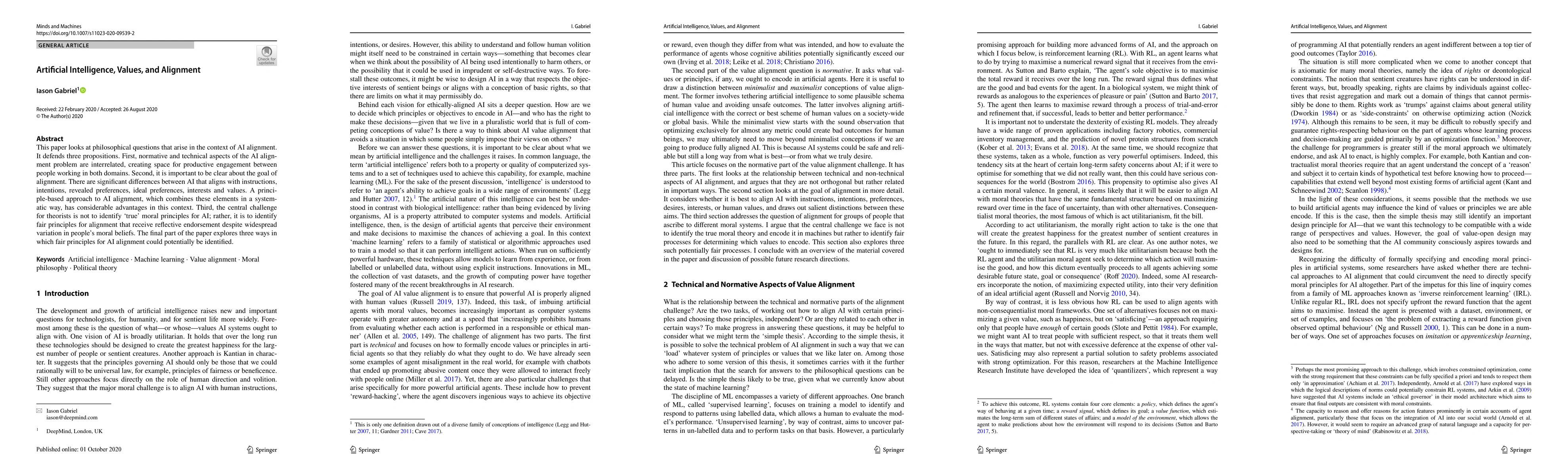 This paper looks at philosophical questions that arise in the context of AI alignment. It defends three propositions. First, normative and technical aspects of the AI alignment problem are interrelated, creating space for productive engagement between people working in both domains. Second, it is important to be clear about the goal of alignment. There are significant differences between AI that aligns with instructions, intentions, revealed preferences, ideal preferences, interests and values. A principle-based approach to AI alignment, which combines these elements in a systematic way, has considerable advantages in this context. Third, the central challenge for theorists is not to identify 'true' moral principles for AI; rather, it is to identify fair principles for alignment, that receive reflective endorsement despite widespread variation in people's moral beliefs. The final part of the paper explores three ways in which fair principles for AI alignment could potentially be identified.