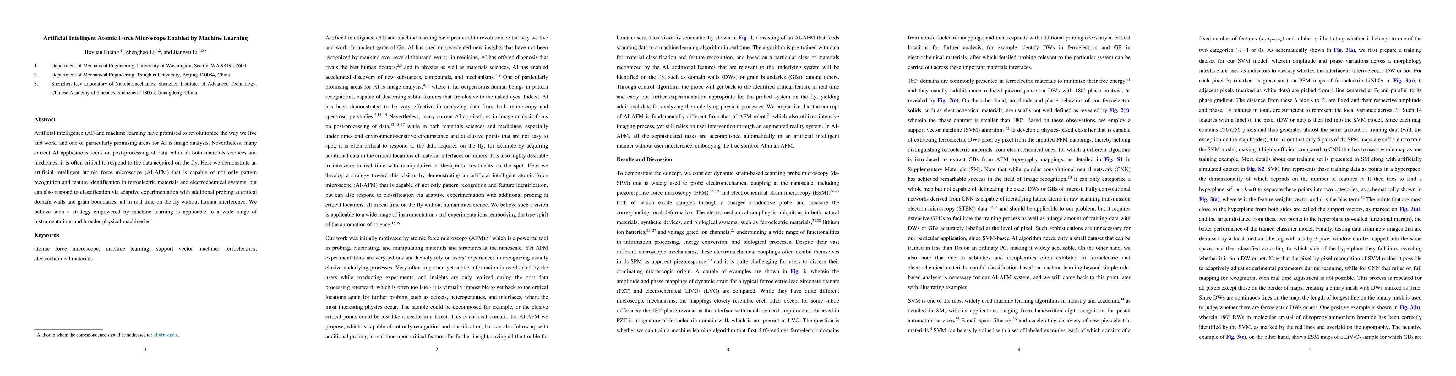 The research demonstrates an Artificial Intelligent Atomic Force Microscope (AI-AFM) that performs real-time data analysis and adaptive experimentation in materials sciences and electrochemical systems. It uses machine learning, specifically Support Vector Machines (SVM), to classify samples, identify domain walls (DWs), and grain boundaries (GBs) without human intervention.