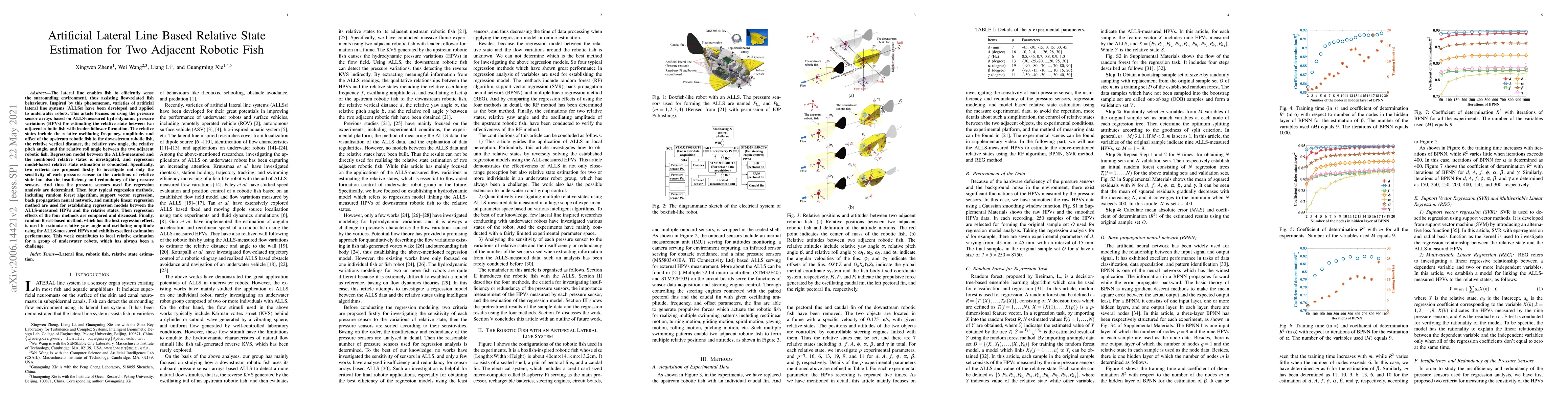 The lateral line enables fish to efficiently sense the surrounding environment, thus assisting flow-related fish behaviours. Inspired by this phenomenon, varieties of artificial lateral line systems (ALLSs) have been developed and applied to underwater robots. This article focuses on using the pressure sensor arrays based on ALLS-measured hydrodynamic pressure variations (HPVs) for estimating the relative state between two adjacent robotic fish with leader-follower formation. The relative states include the relative oscillating frequency, amplitude, and offset of the upstream robotic fish to the downstream robotic fish, the relative vertical distance, the relative yaw angle, the relative pitch angle, and the relative roll angle between the two adjacent robotic fish. Regression model between the ALLS-measured and the mentioned relative states is investigated, and regression model-based relative state estimation is conducted. Specifically, two criteria are proposed firstly to investigate not only the sensitivity of each pressure sensor to the variations of relative state but also the insufficiency and redundancy of the pressure sensors. And thus the pressure sensors used for regression analysis are determined. Then four typical regression methods, including random forest algorithm, support vector regression, back propagation neural network, and multiple linear regression method are used for establishing regression models between the ALLS-measured HPVs and the relative states. Then regression effects of the four methods are compared and discussed. Finally, random forest-based method, which has the best regression effect, is used to estimate relative yaw angle and oscillating amplitude using the ALLS-measured HPVs and exhibits excellent estimation performance. This work contributes to local relative estimation for a group of underwater robots, which has always been a challenge.