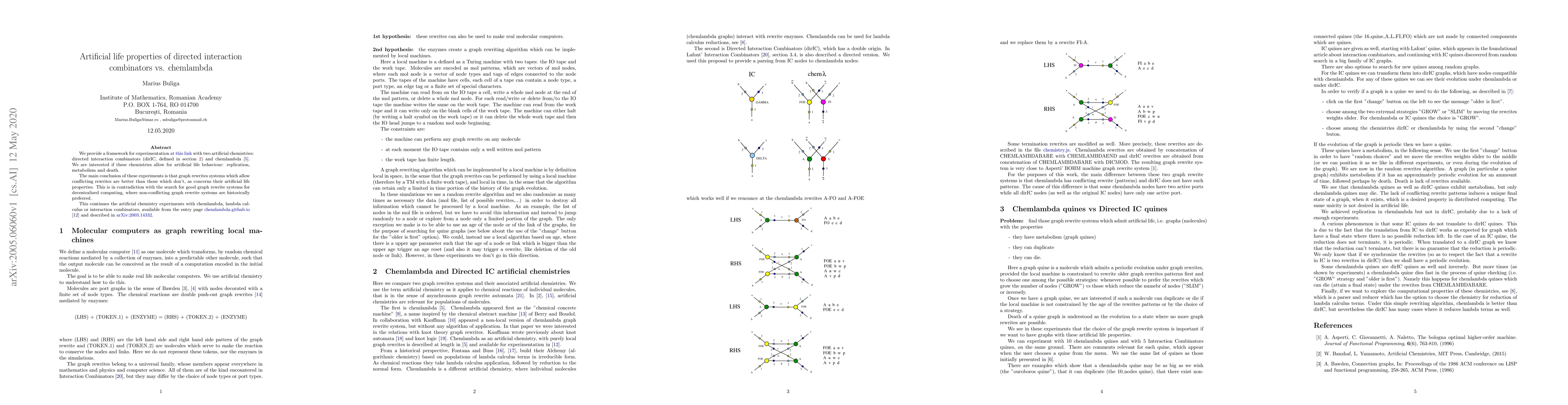 This paper compares directed interaction combinators (dirIC) and chemlambda, two artificial chemistries, to determine if they exhibit artificial life properties like replication, metabolism, and death. The study concludes that graph rewrite systems allowing conflicting rewrites better support artificial life behaviors, contrary to the preference for non-conflicting systems in decentralized computing.